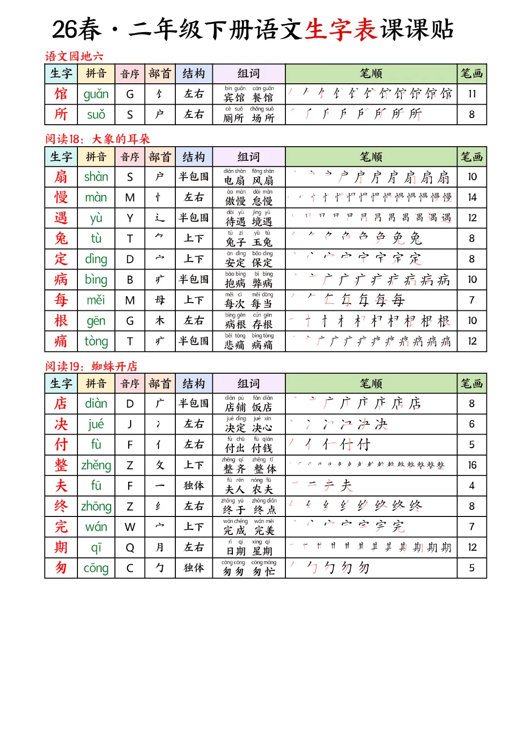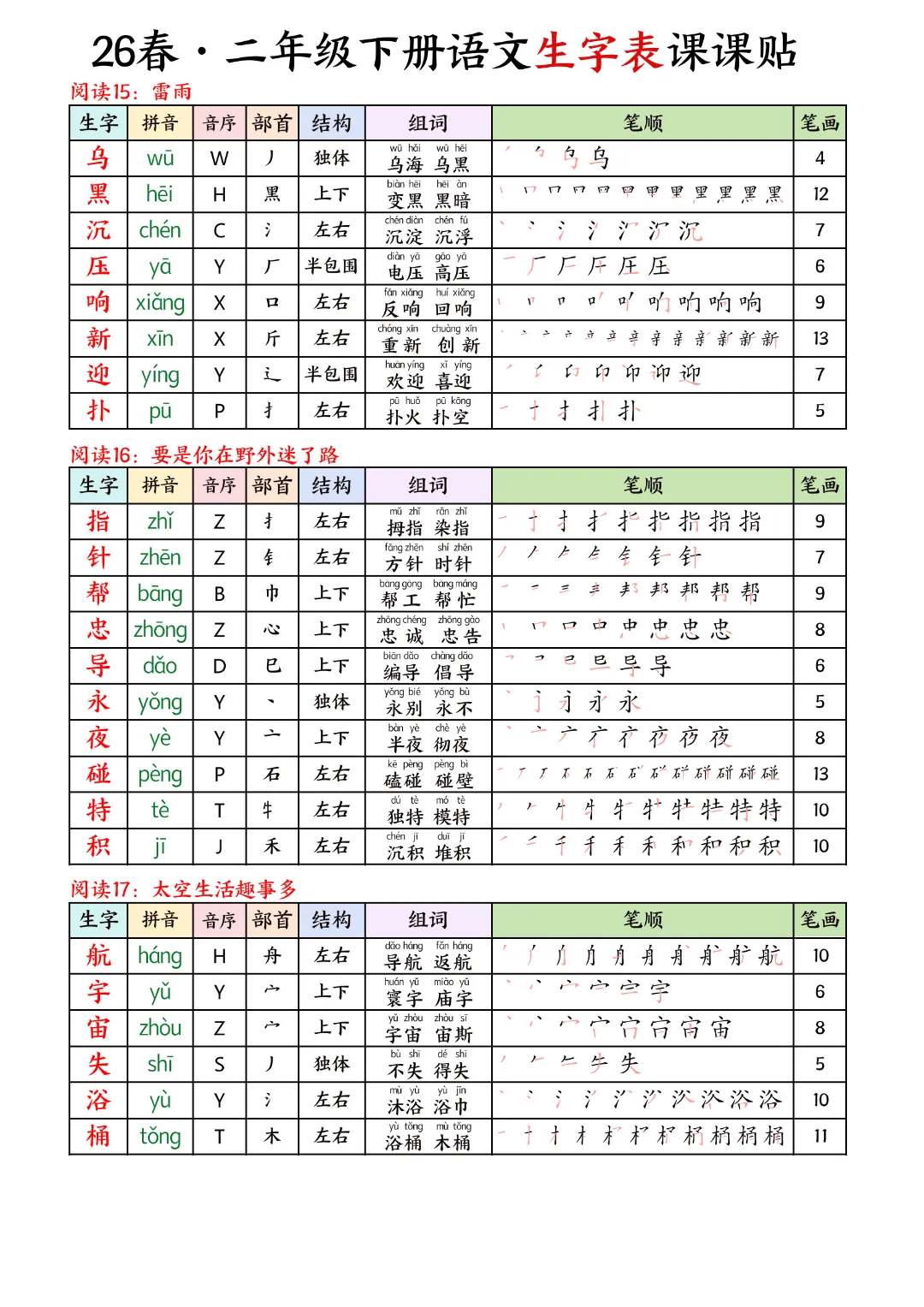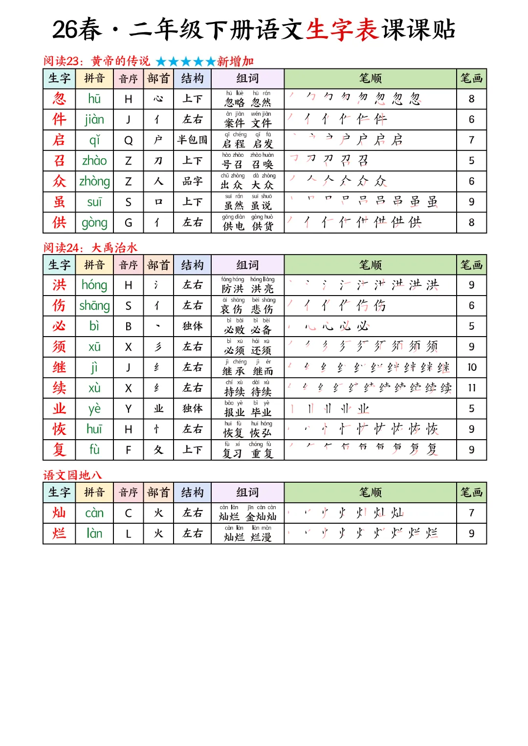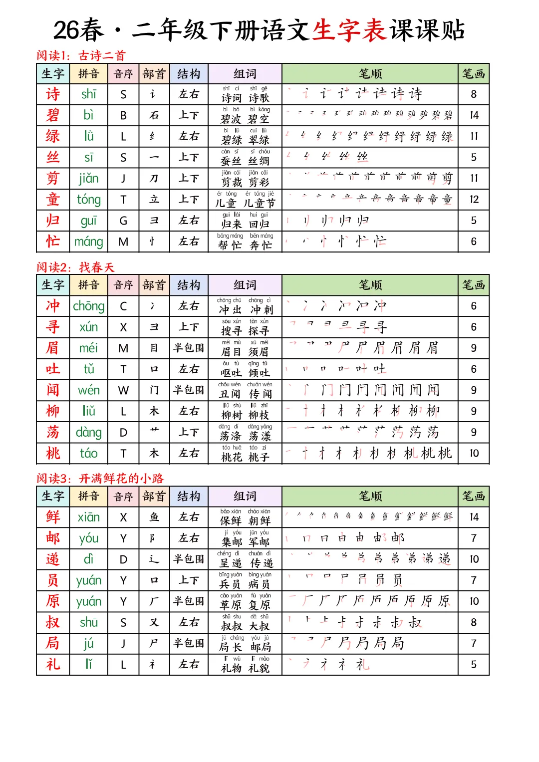 2026年春新版二年级下册语文人教部编版生字表课课贴,可电子版下载打印,助力新学期学习更高效,需要的家长可以打印出来,让孩子每天练一练!帮助孩子巩固基础,提升成绩!