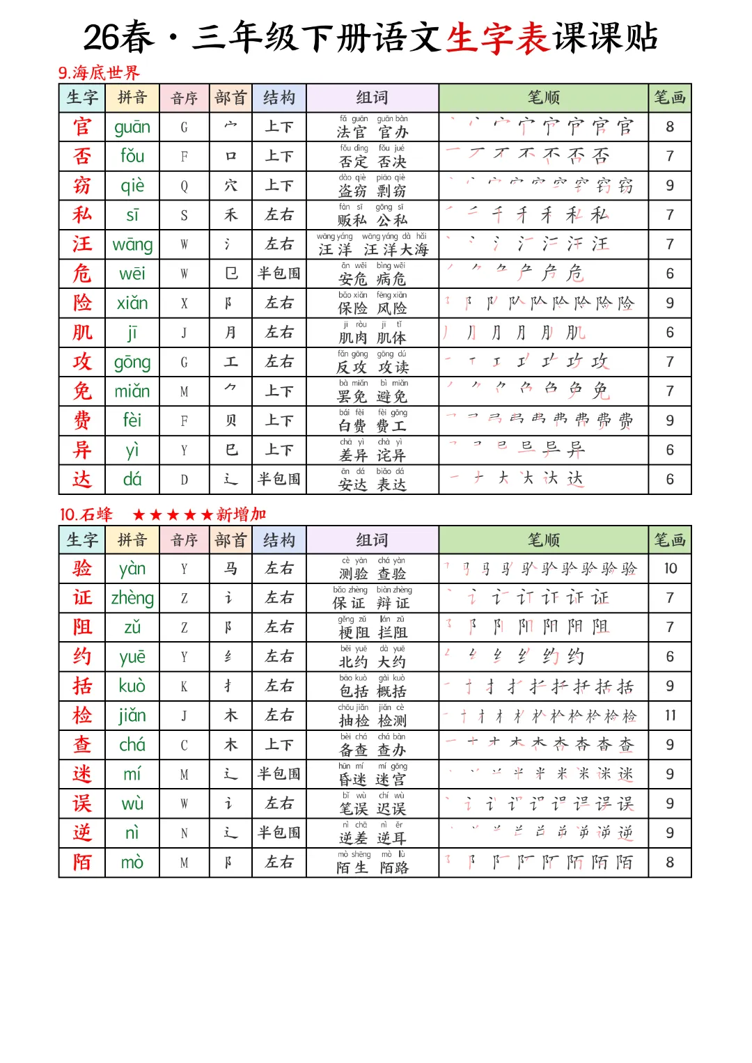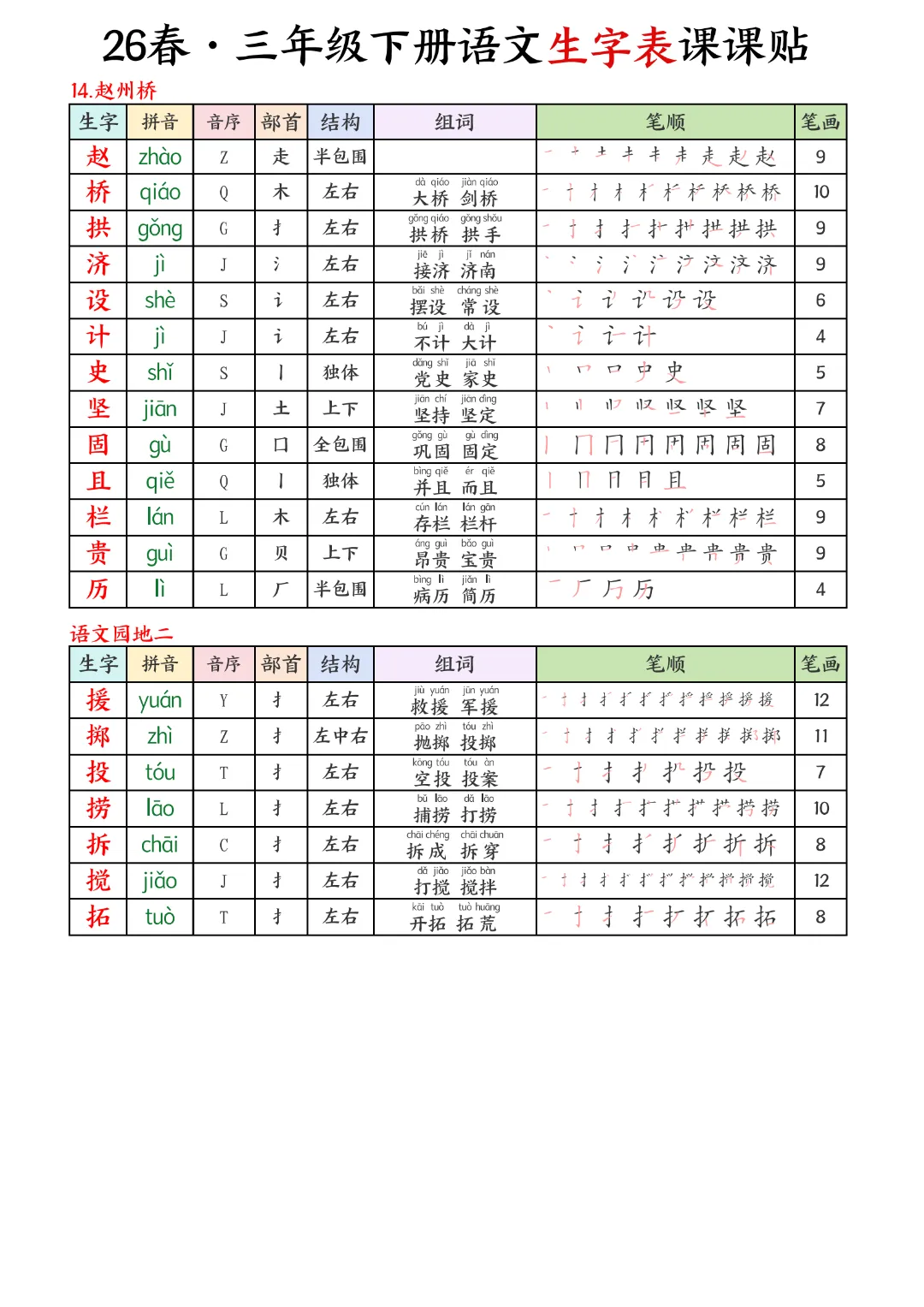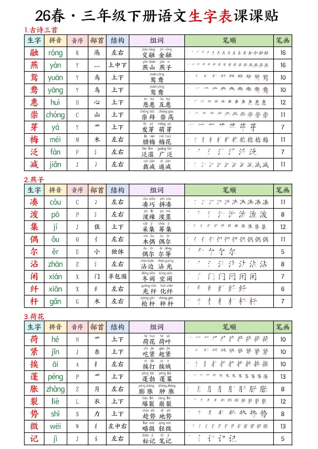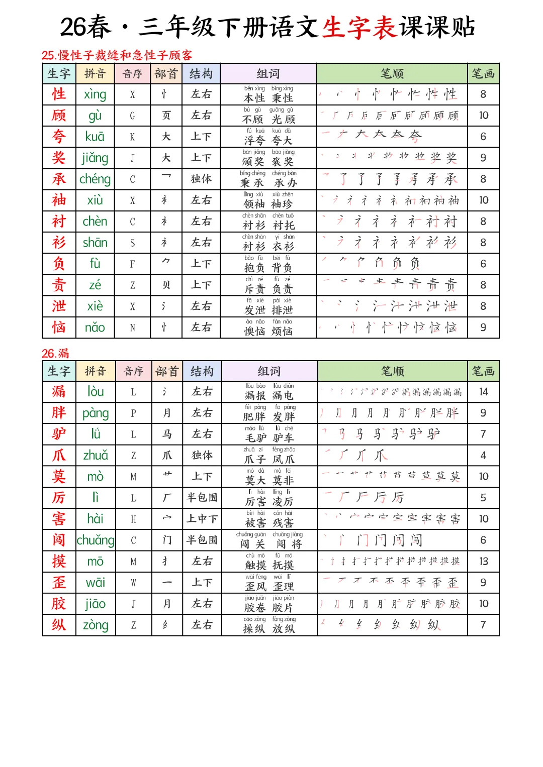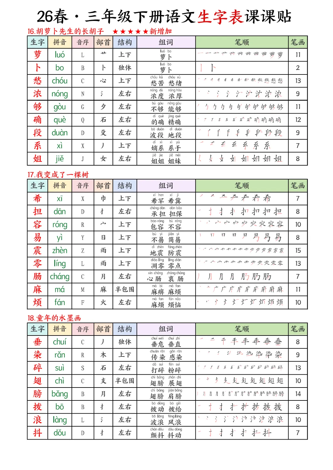 2026年春新版三年级下册语文人教部编版生字表课课贴,可电子版下载打印,助力新学期学习更高效,需要的家长可以打印出来,让孩子每天练一练!帮助孩子巩固基础,提升成绩!