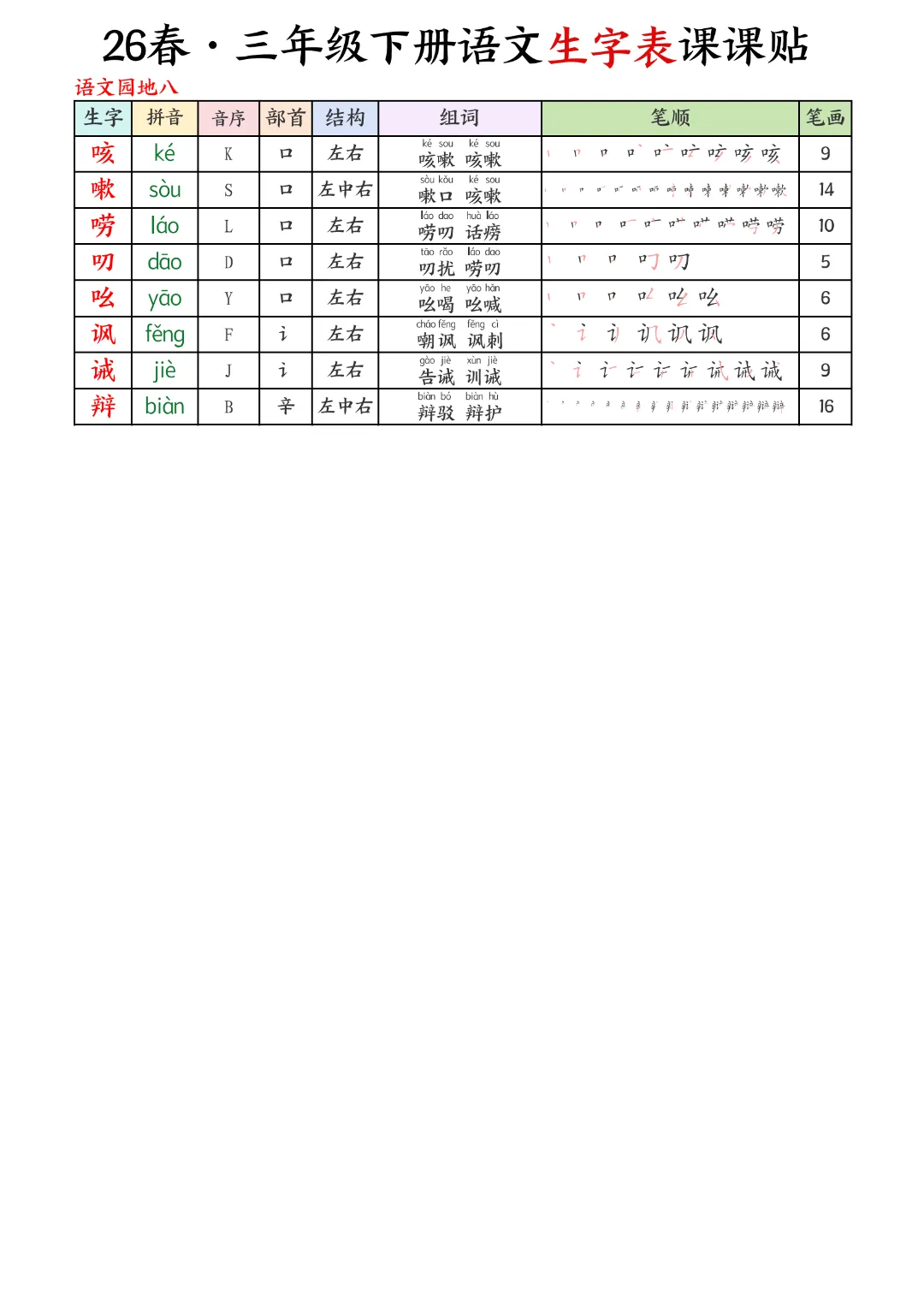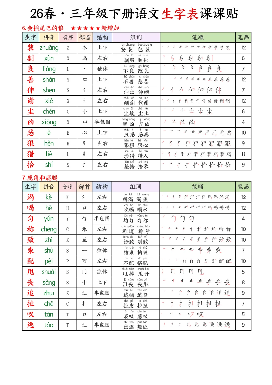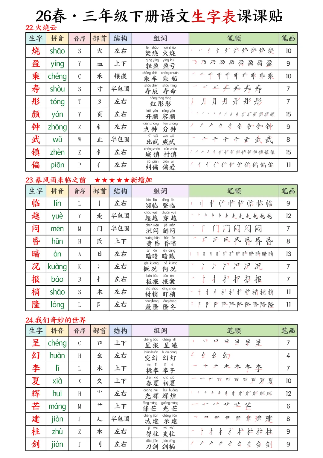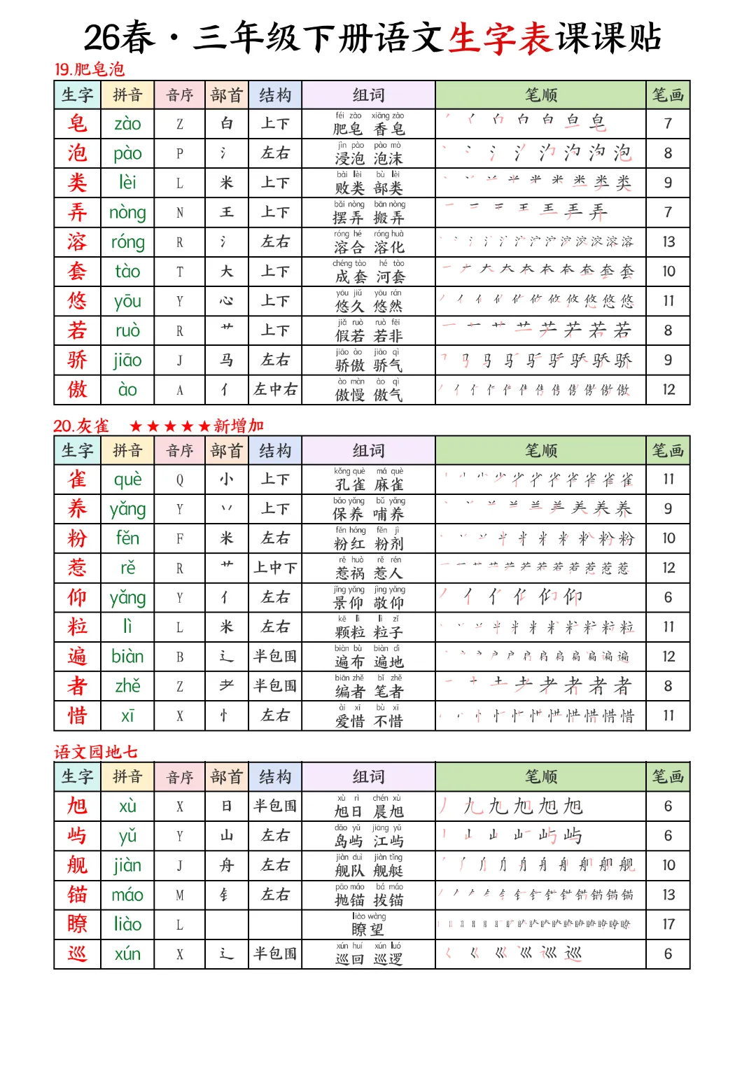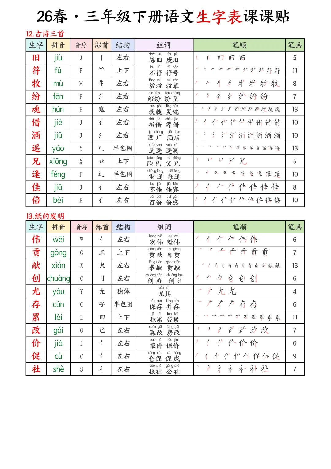 2026年春新版三年级下册语文人教部编版生字表课课贴,可电子版下载打印,助力新学期学习更高效,需要的家长可以打印出来,让孩子每天练一练!帮助孩子巩固基础,提升成绩!