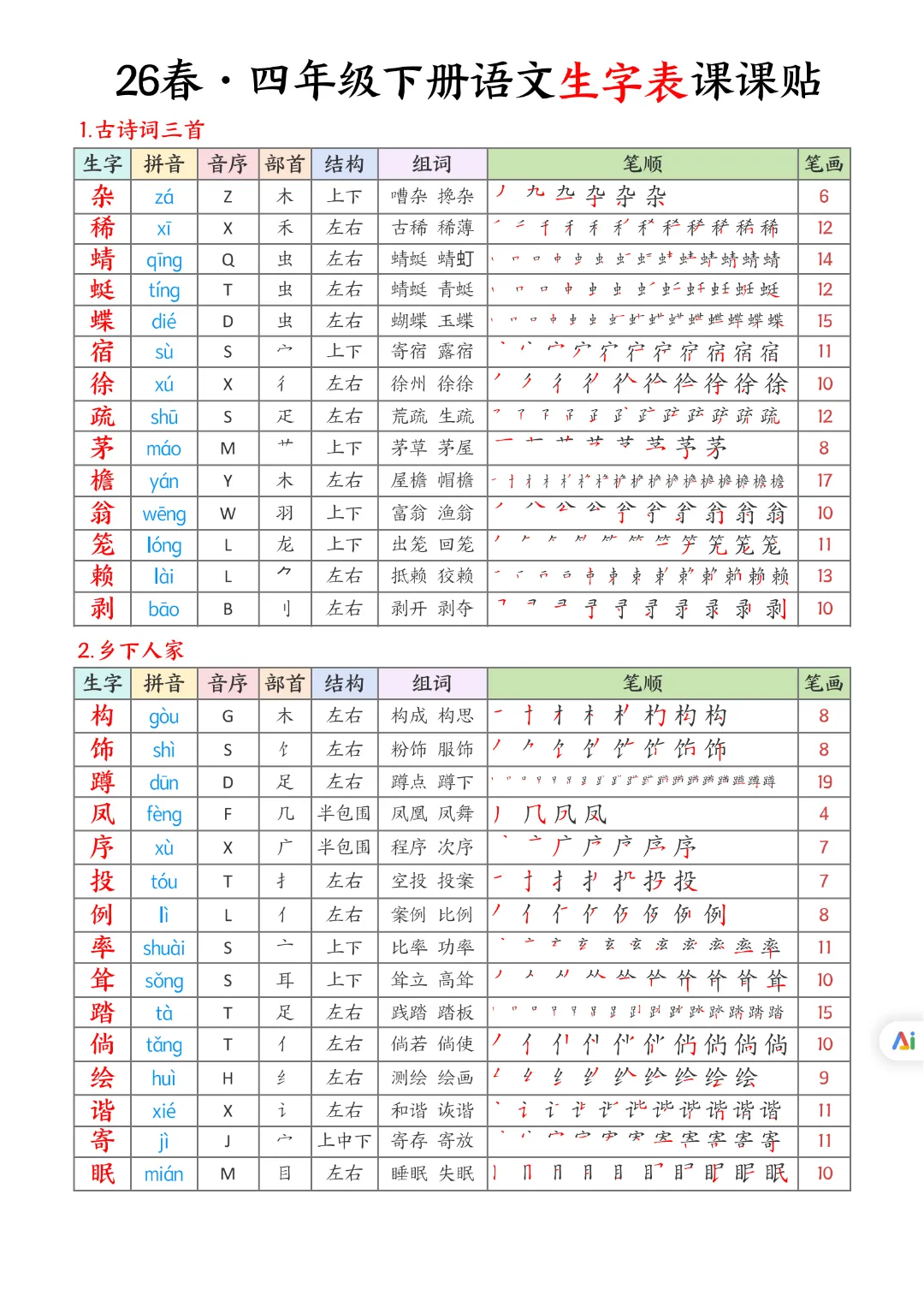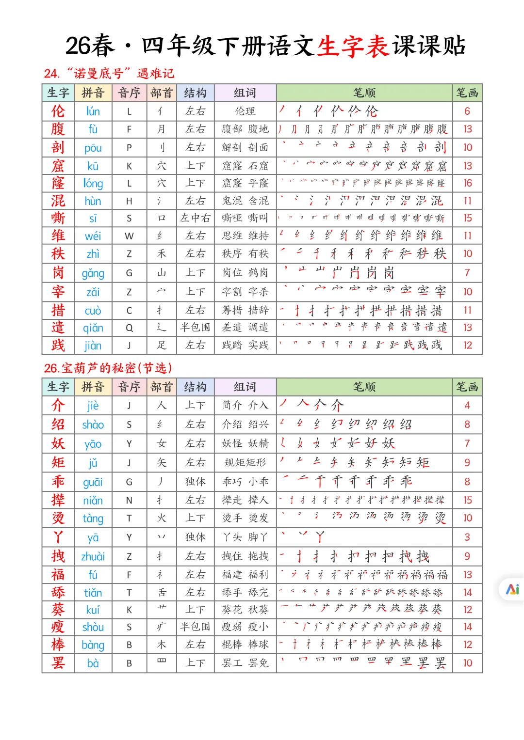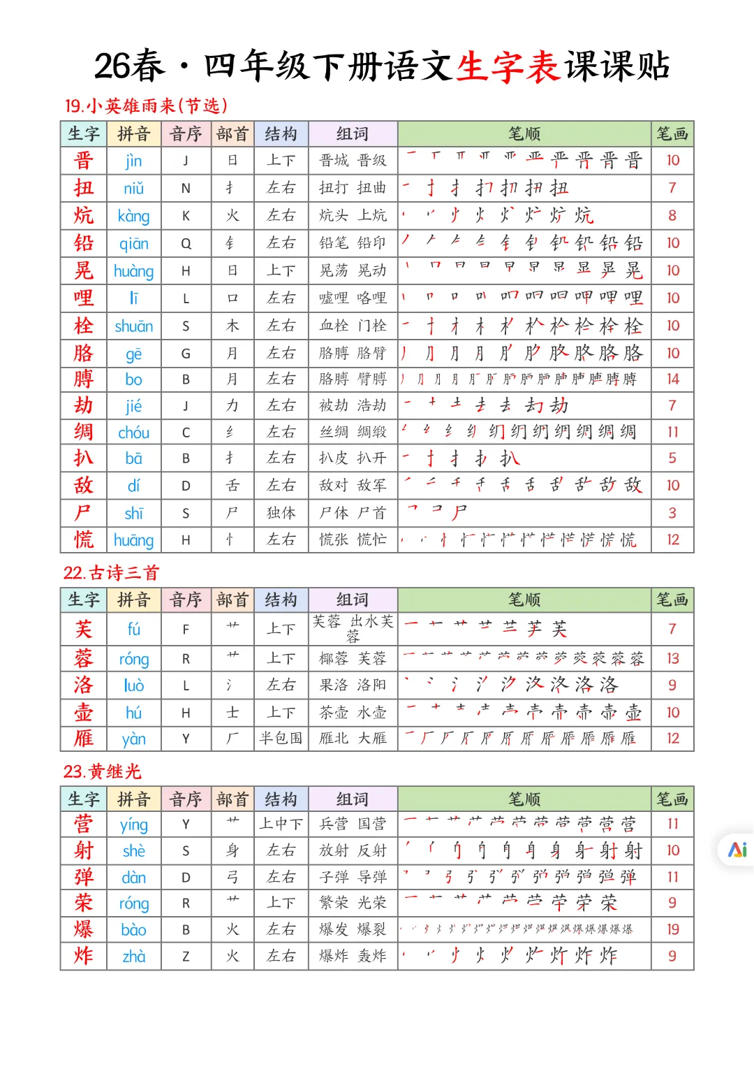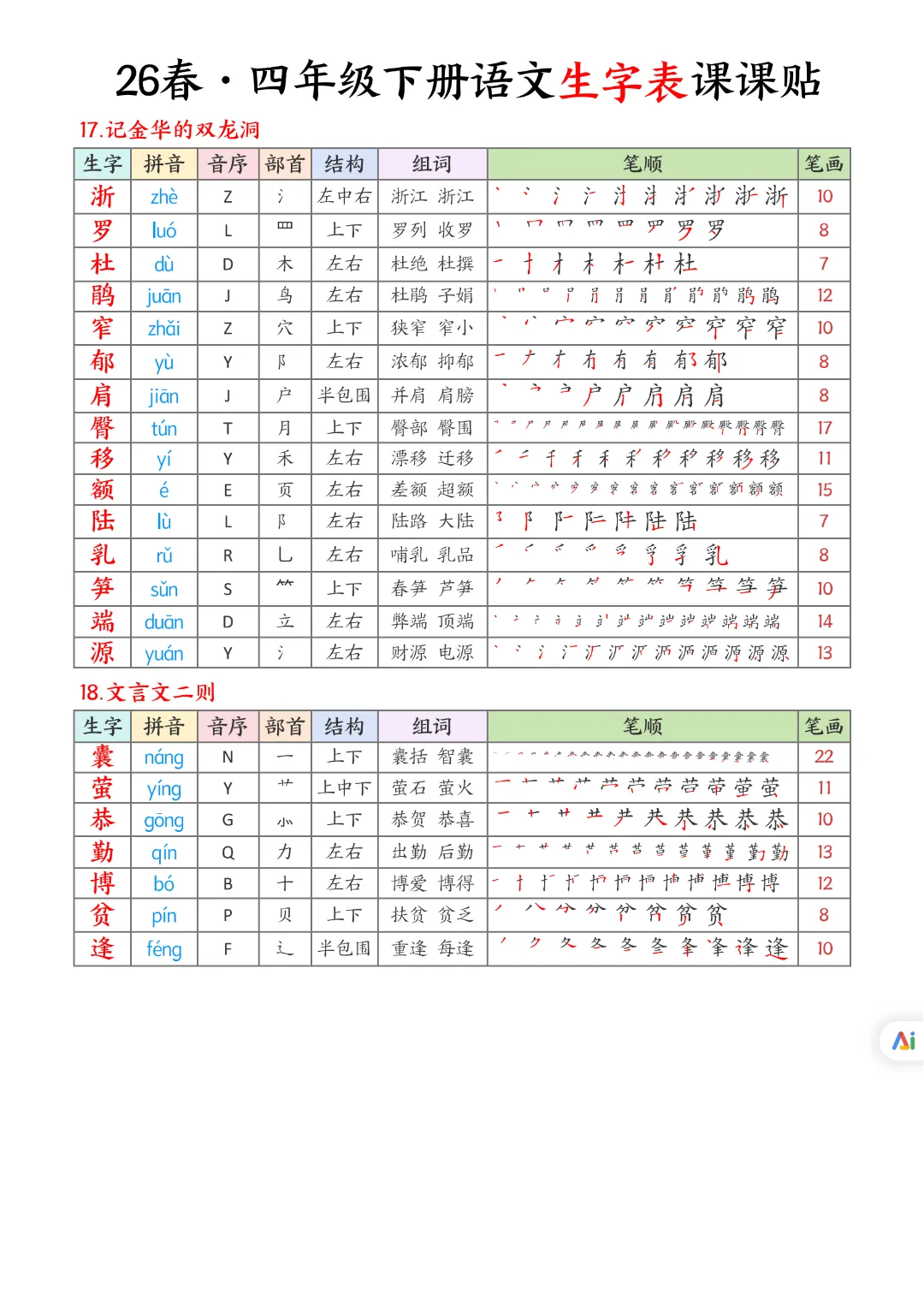 2026年春新版四年级下册语文人教部编版生字表课课贴,可电子版下载打印,助力新学期学习更高效,需要的家长可以打印出来,让孩子每天练一练!帮助孩子巩固基础,提升成绩!