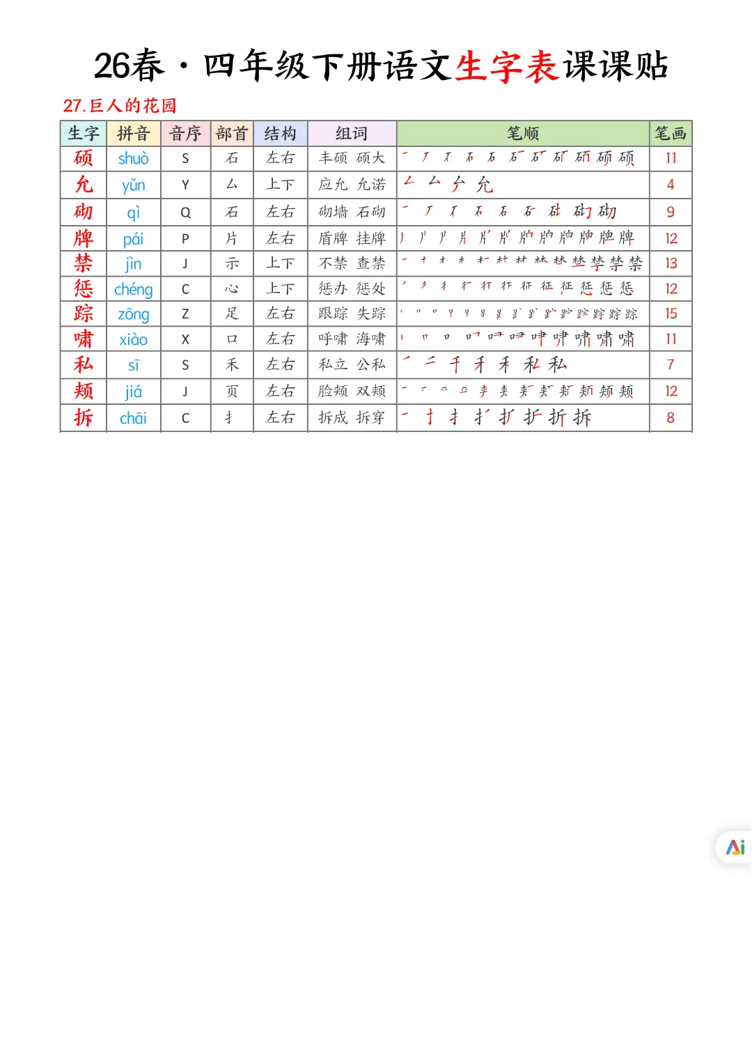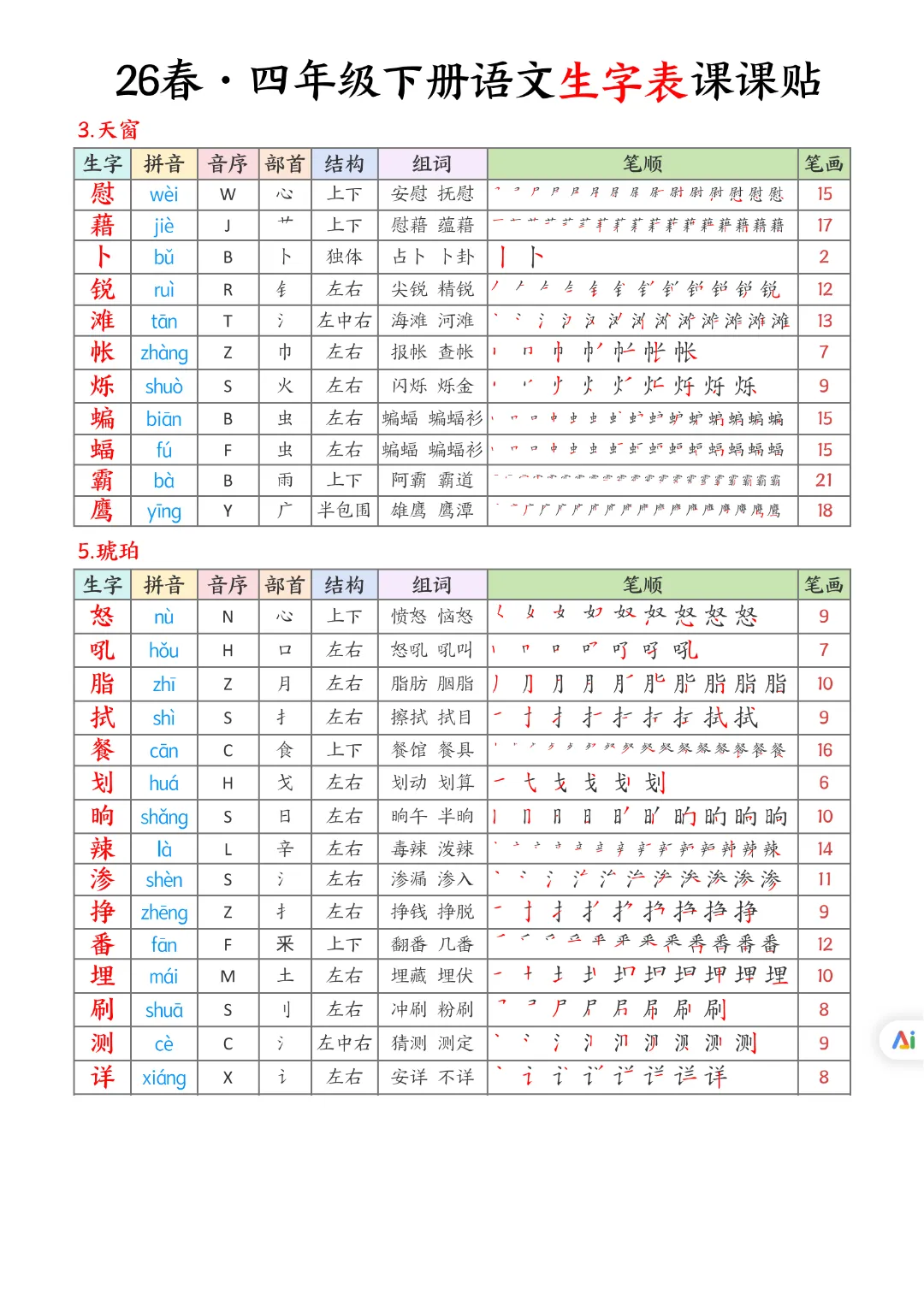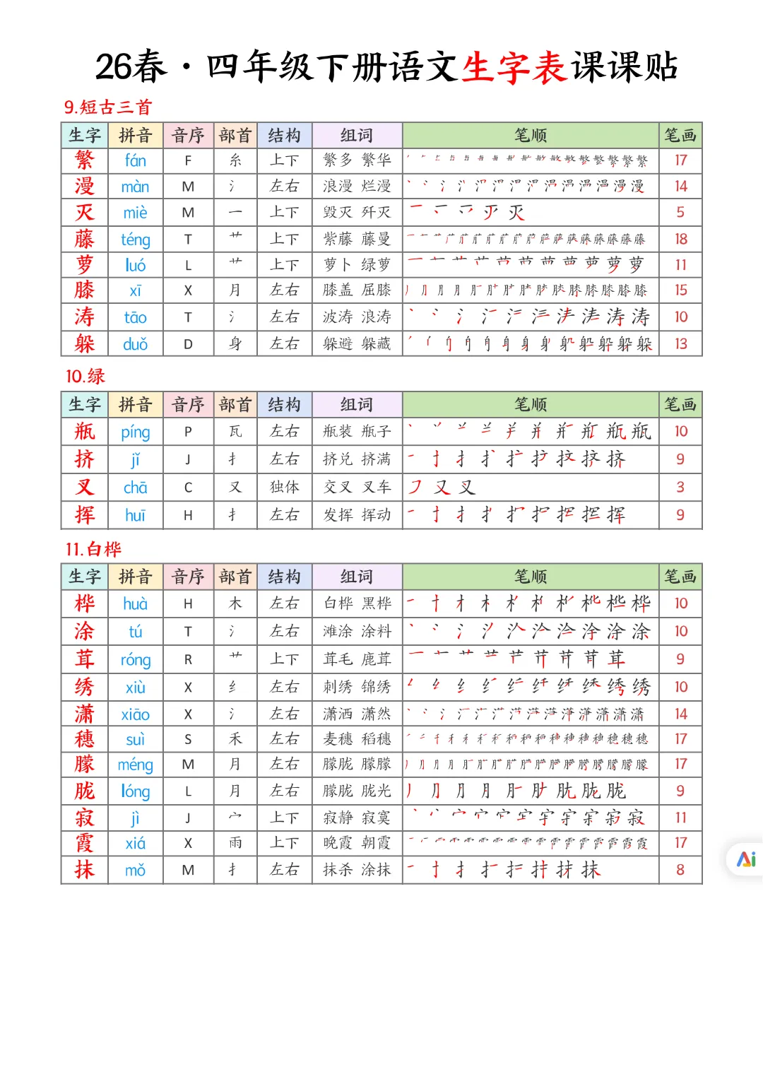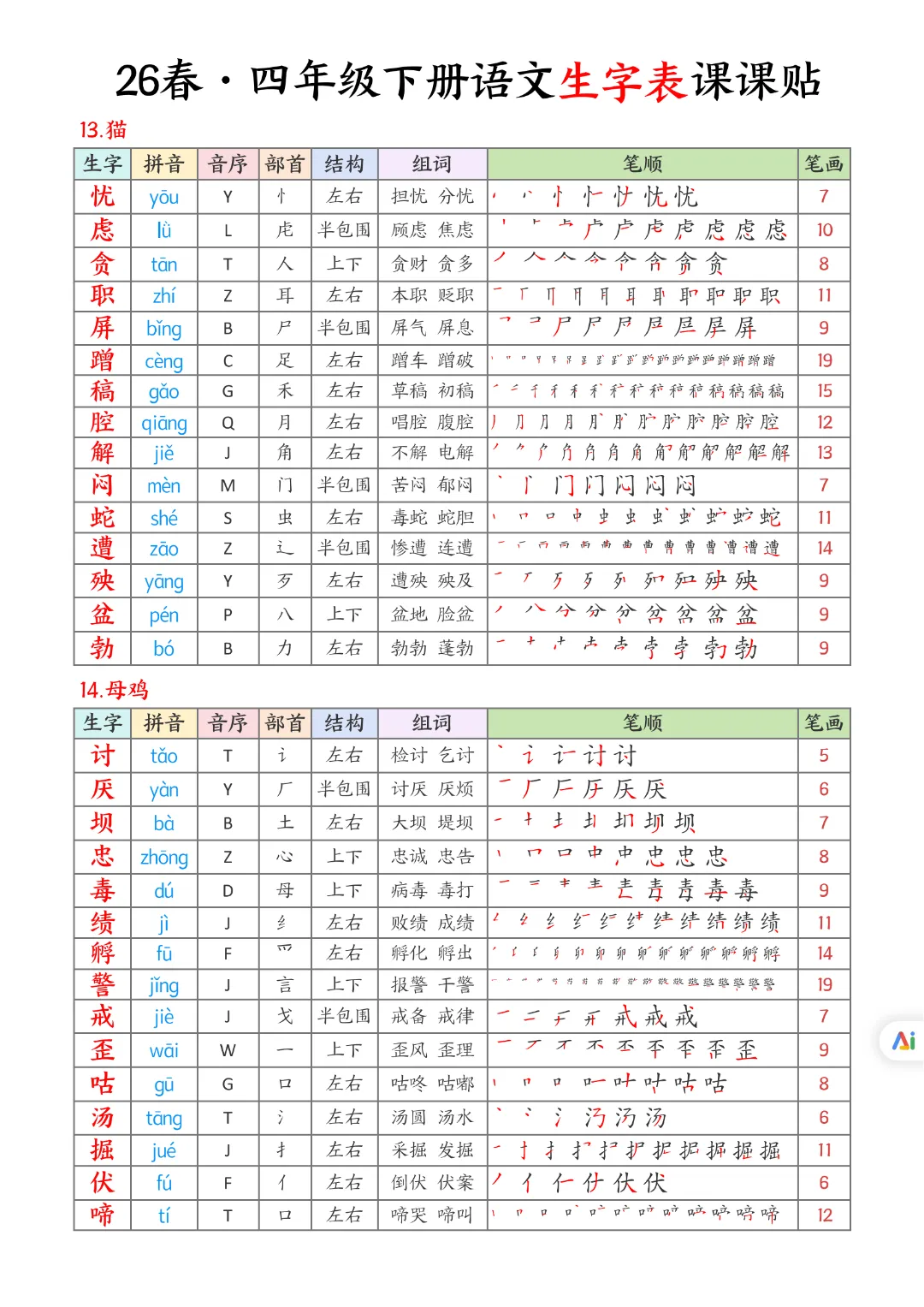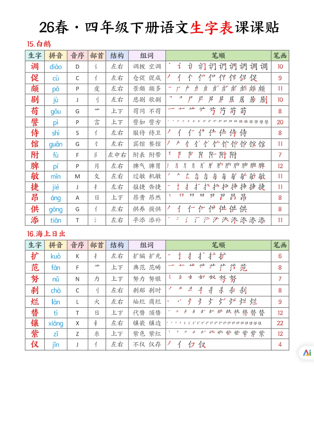 2026年春新版四年级下册语文人教部编版生字表课课贴,可电子版下载打印,助力新学期学习更高效,需要的家长可以打印出来,让孩子每天练一练!帮助孩子巩固基础,提升成绩!
