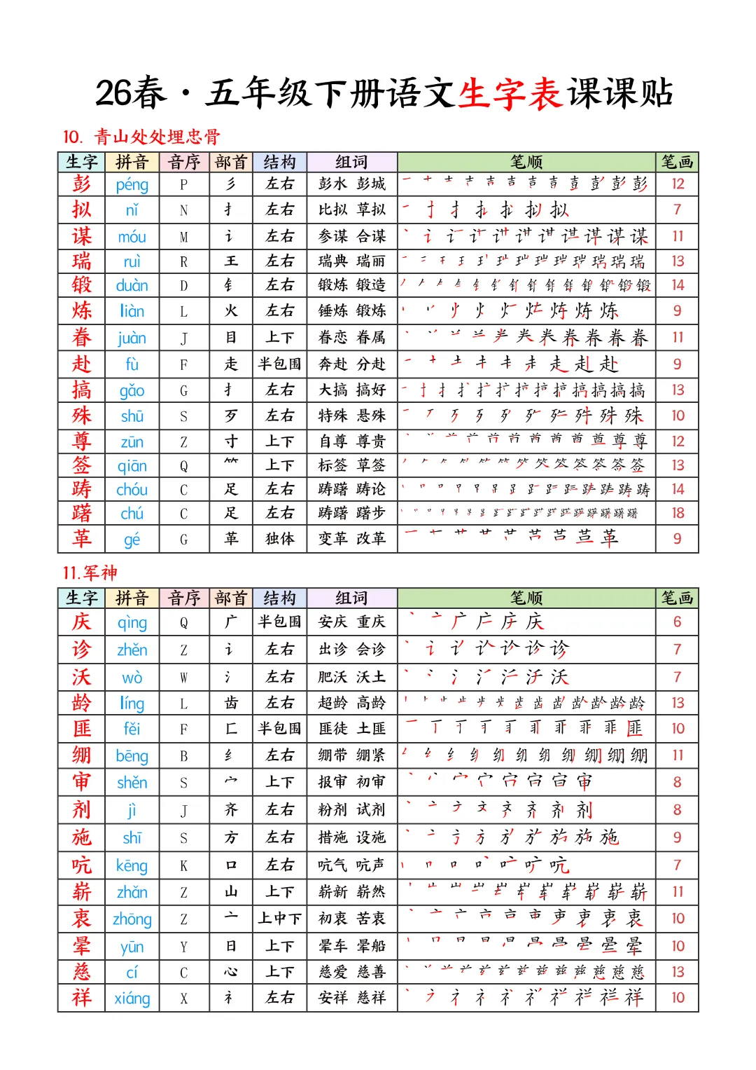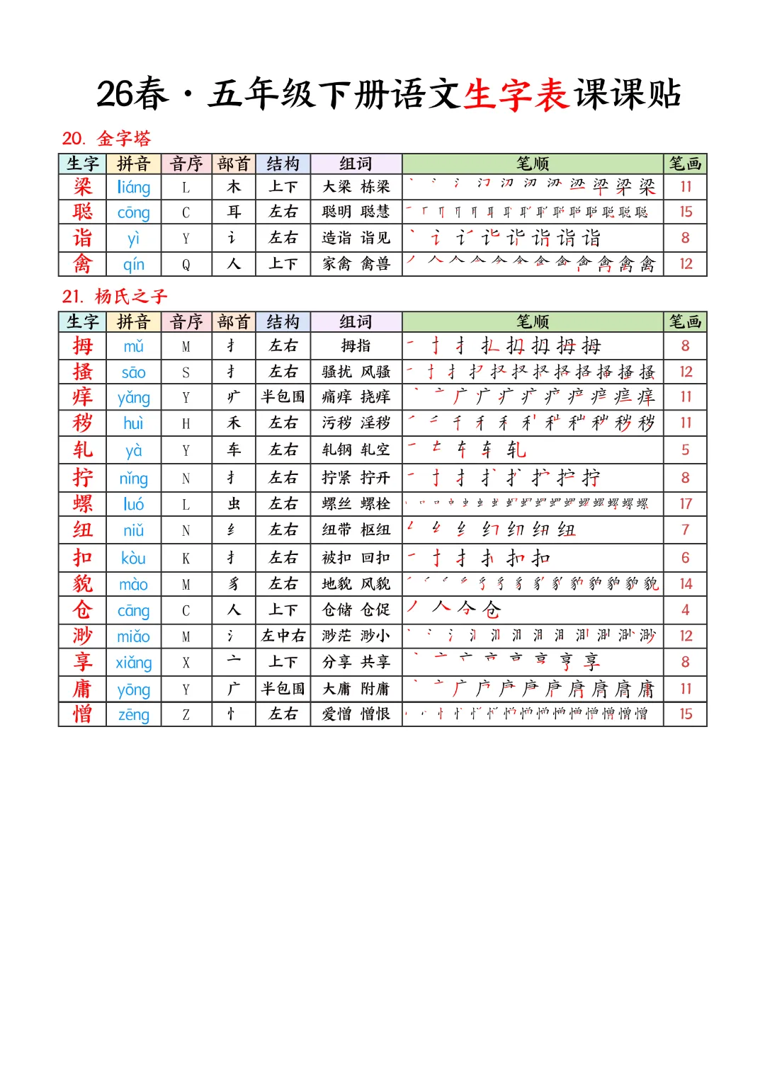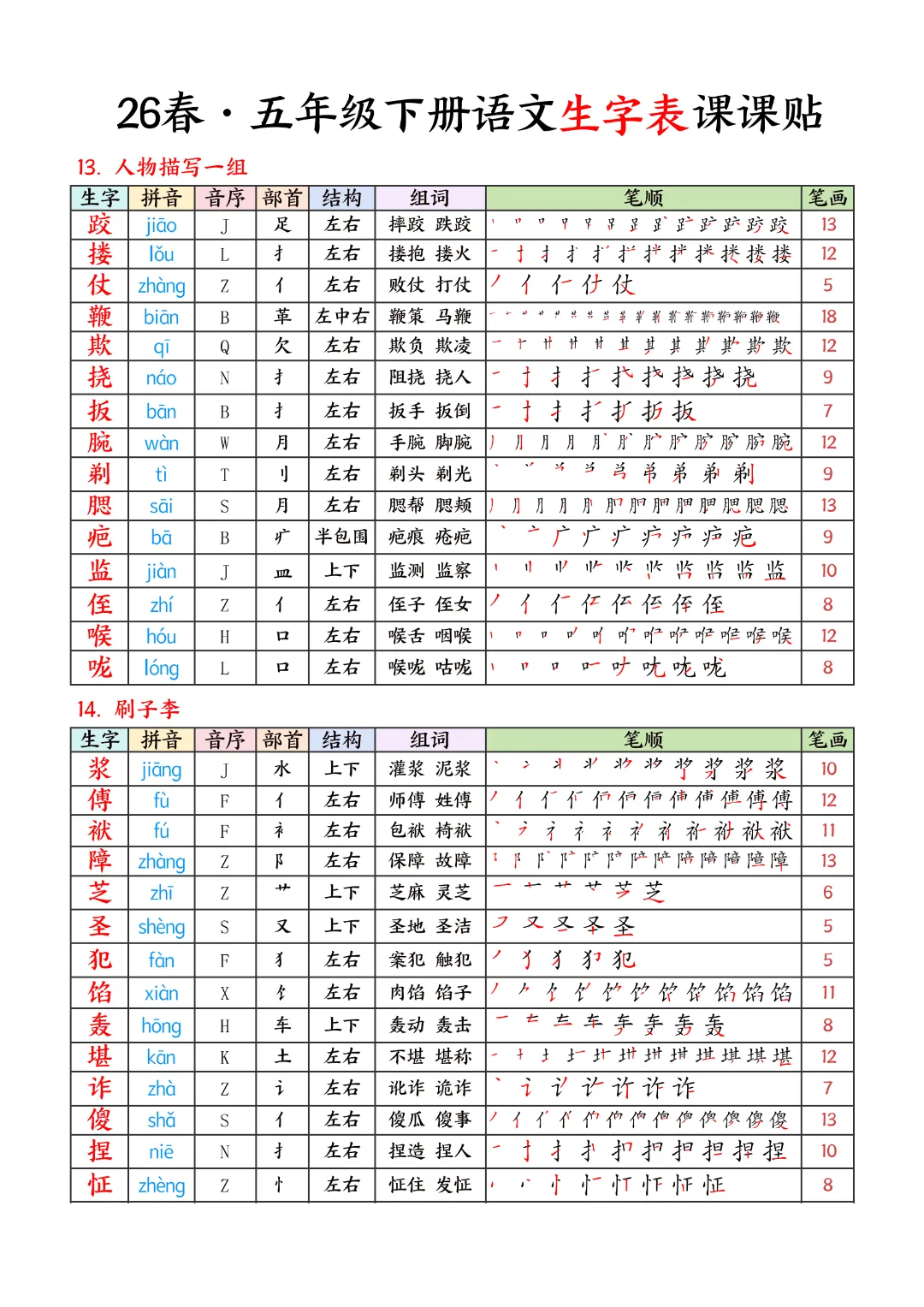 2026年春新版五年级下册语文人教部编版生字表课课贴,可电子版下载打印,助力新学期学习更高效,需要的家长可以打印出来,让孩子每天练一练!帮助孩子巩固基础,提升成绩!