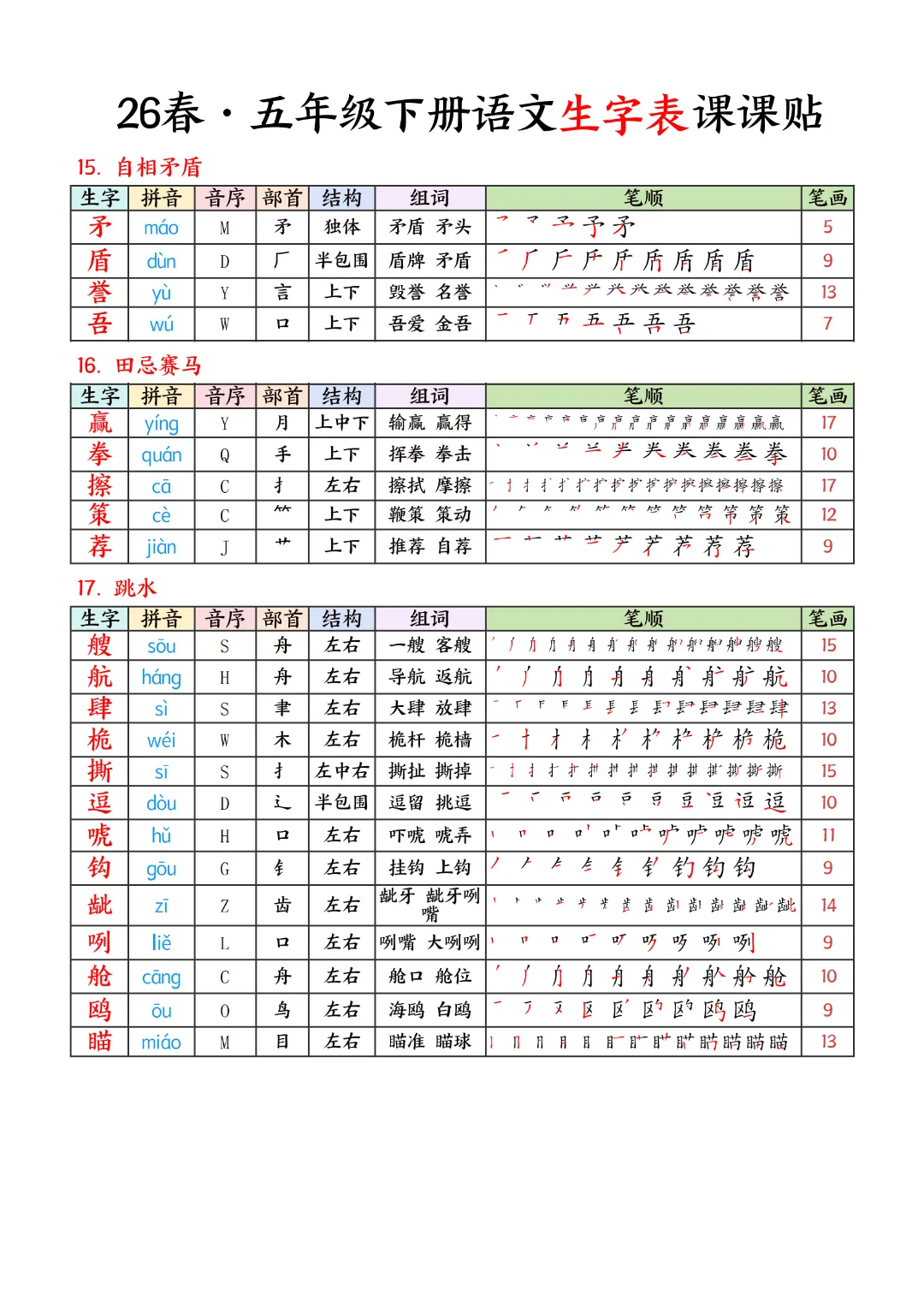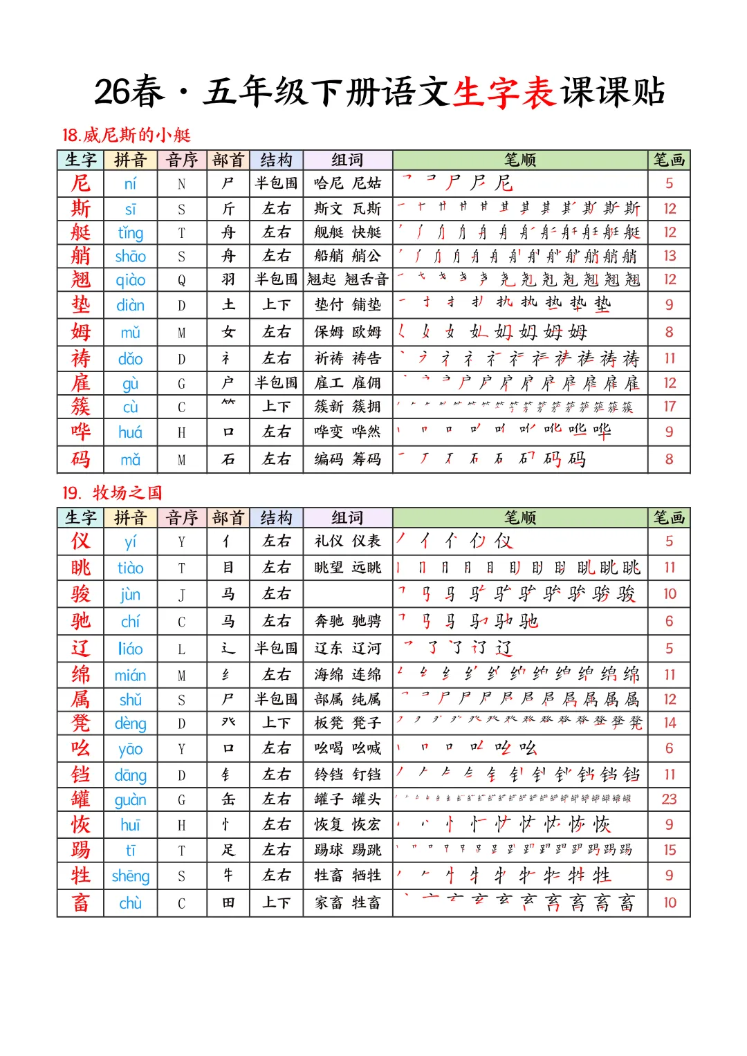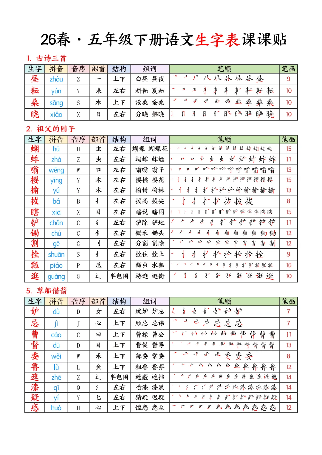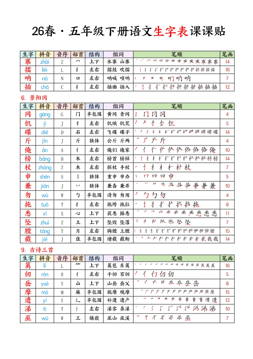 2026年春新版五年级下册语文人教部编版生字表课课贴,可电子版下载打印,助力新学期学习更高效,需要的家长可以打印出来,让孩子每天练一练!帮助孩子巩固基础,提升成绩!