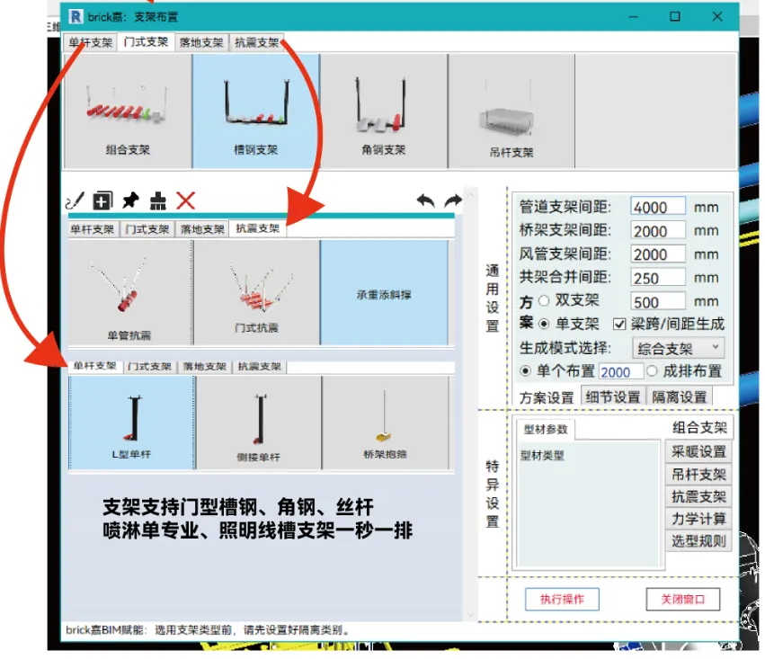 2. 成排管道自动选型、自动生成支架