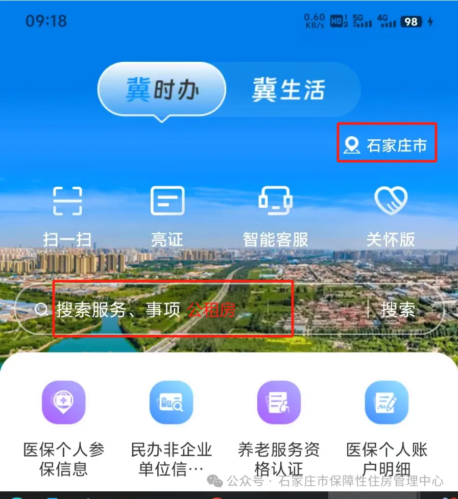 2、冀时办登录,进入首页,首页右上角选择“石家庄”,再点击查询“公租房”。