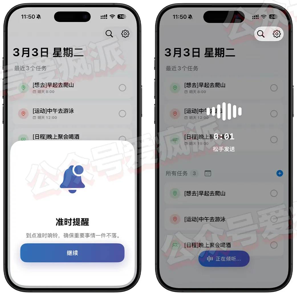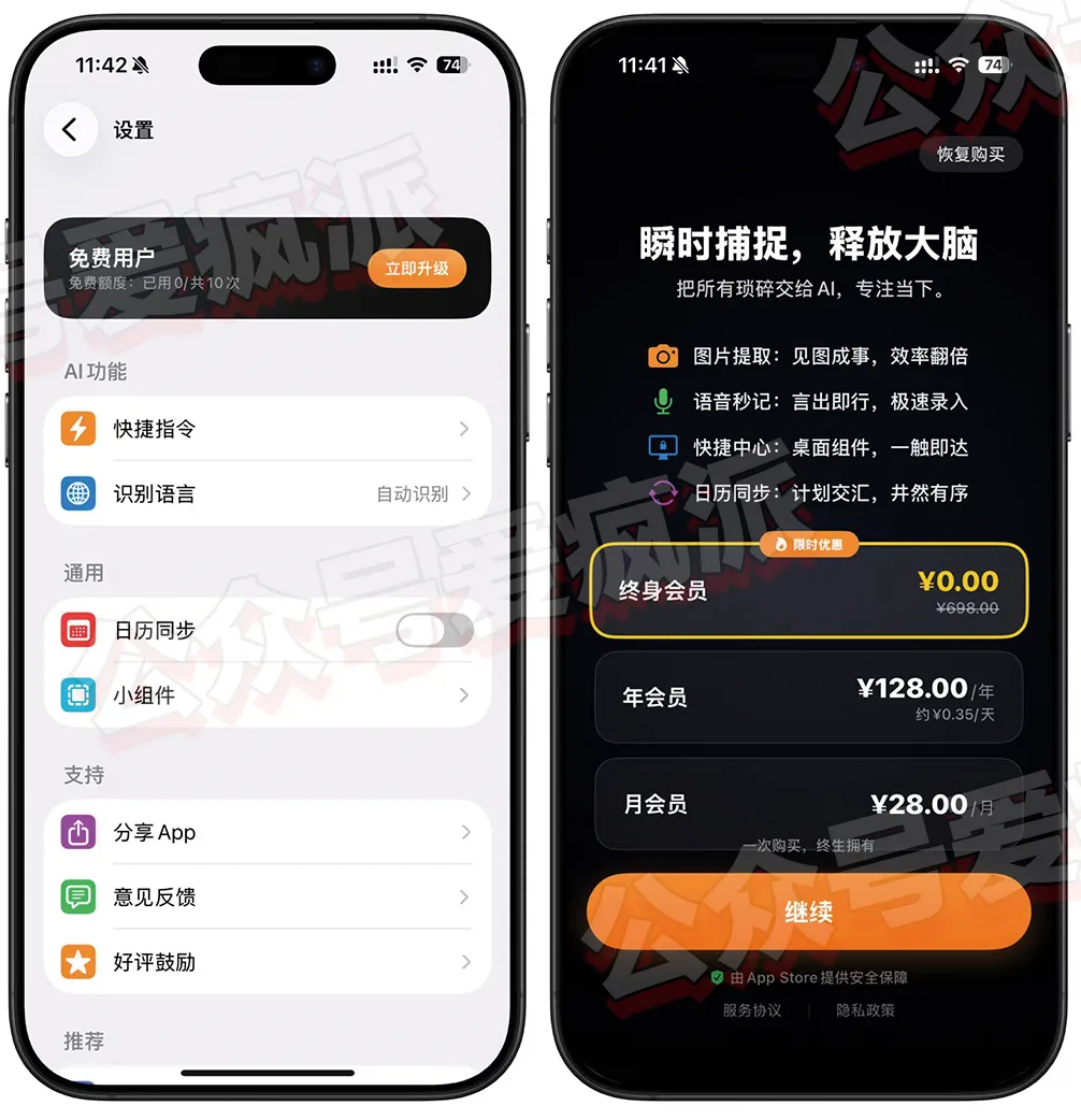 App Store 终身会员!无网络限制 大家好!分享一个语言AI 智能待办事项提醒软件,目前可以免费获取它的终身订阅,打开软件完成初始化就会进入内购,或者从设置进入,终身显示0即可免费获取! 随口记 不用打字,随口一说,AI就会自动生成待办清单!专为懒人设计的极速语音助手。乱语秒变计划,自动拆解任务,让你的大脑从此零负担。支持锁屏与桌面小组件,快来体验言出即行的快感! 获取方式 测试了一下,识别速度不错,正常网络也可以使用,感兴趣的普速度获取。安装软件需要iOS16.0及以上! ① App Store 终身会员!速收! ② iOS26.4系统更新!加载Bug终于解决 ③¥148终身买断,速收!