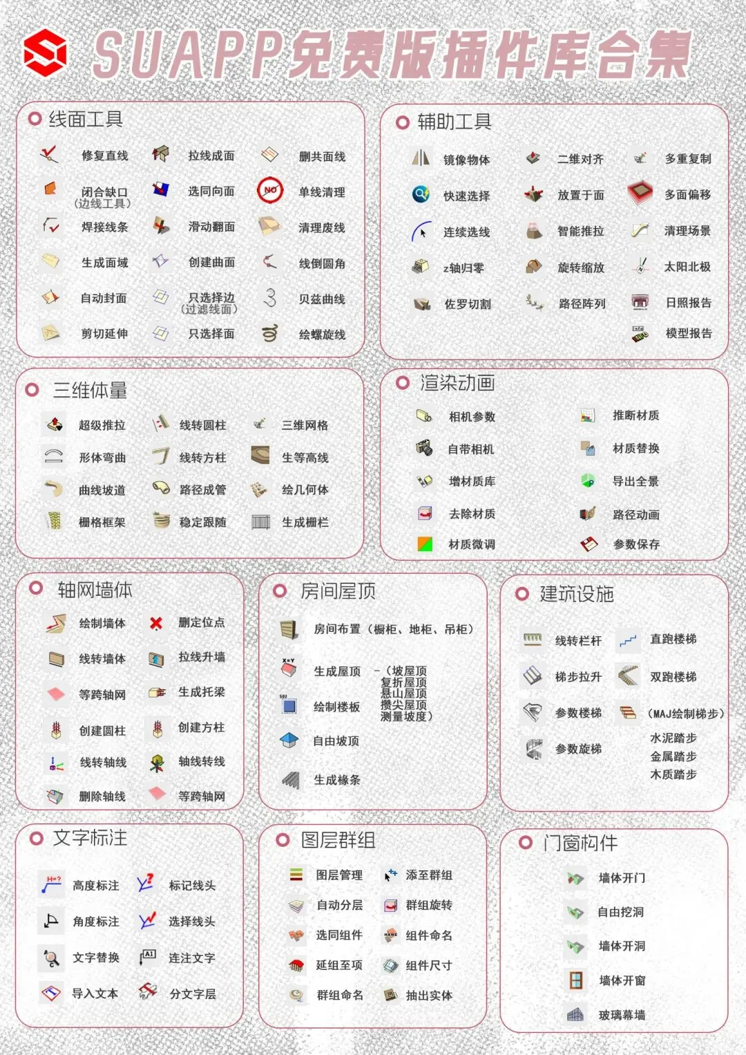 SUAPP免费版(SUAPP Free)并非”阉割版”,而是提供了固定的100+核心插件命令,覆盖建筑、景观、室内、规划、工业等全设计领域。