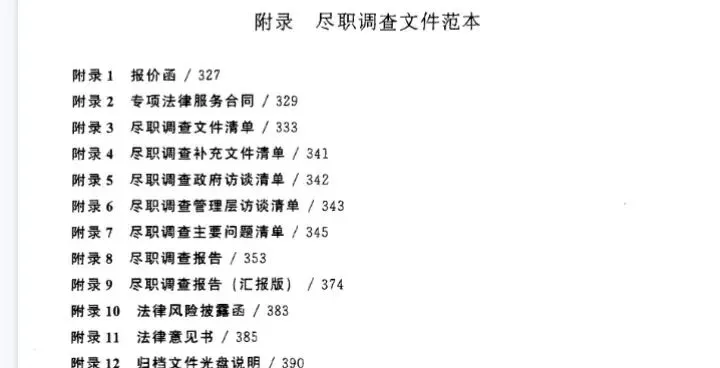内容包括总则、尽职调查原则、范围、方式、流程、主体、运营、财务、财产、合同、劳动人事、合规、争议解决等,附尽职调查文件范本,适合法律、企业合规、内控、财务学习参考。