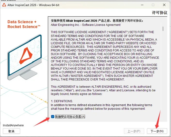 7、勾选我接受许可协议条款,点击下一步。