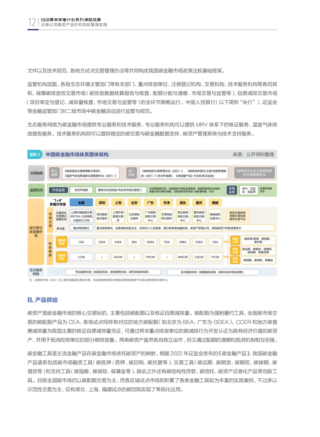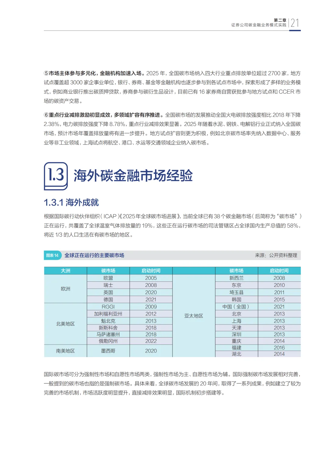 第一部分从宏观层面总结碳金融市场发展情况,梳理了中国碳金融市场的发展历程、市场体系、供求状况及运行机制,并对比分析了海外成熟市场经验,厘清当前市场存在的问题与挑战。