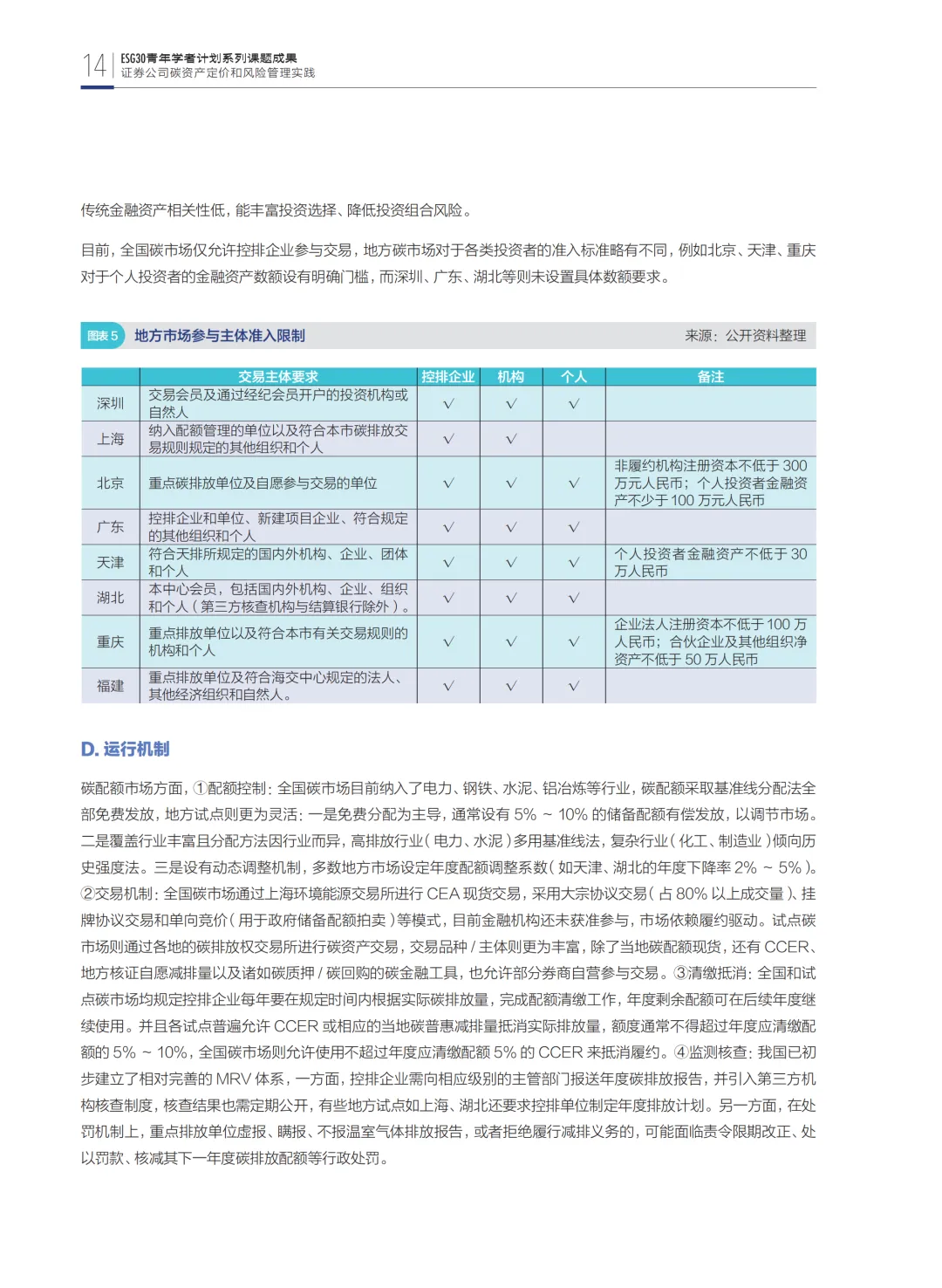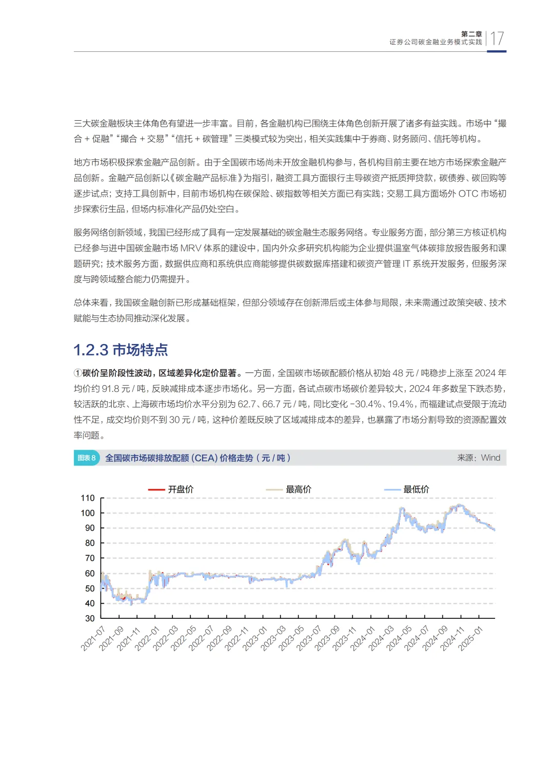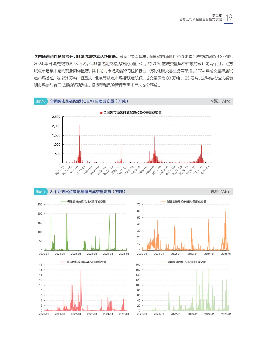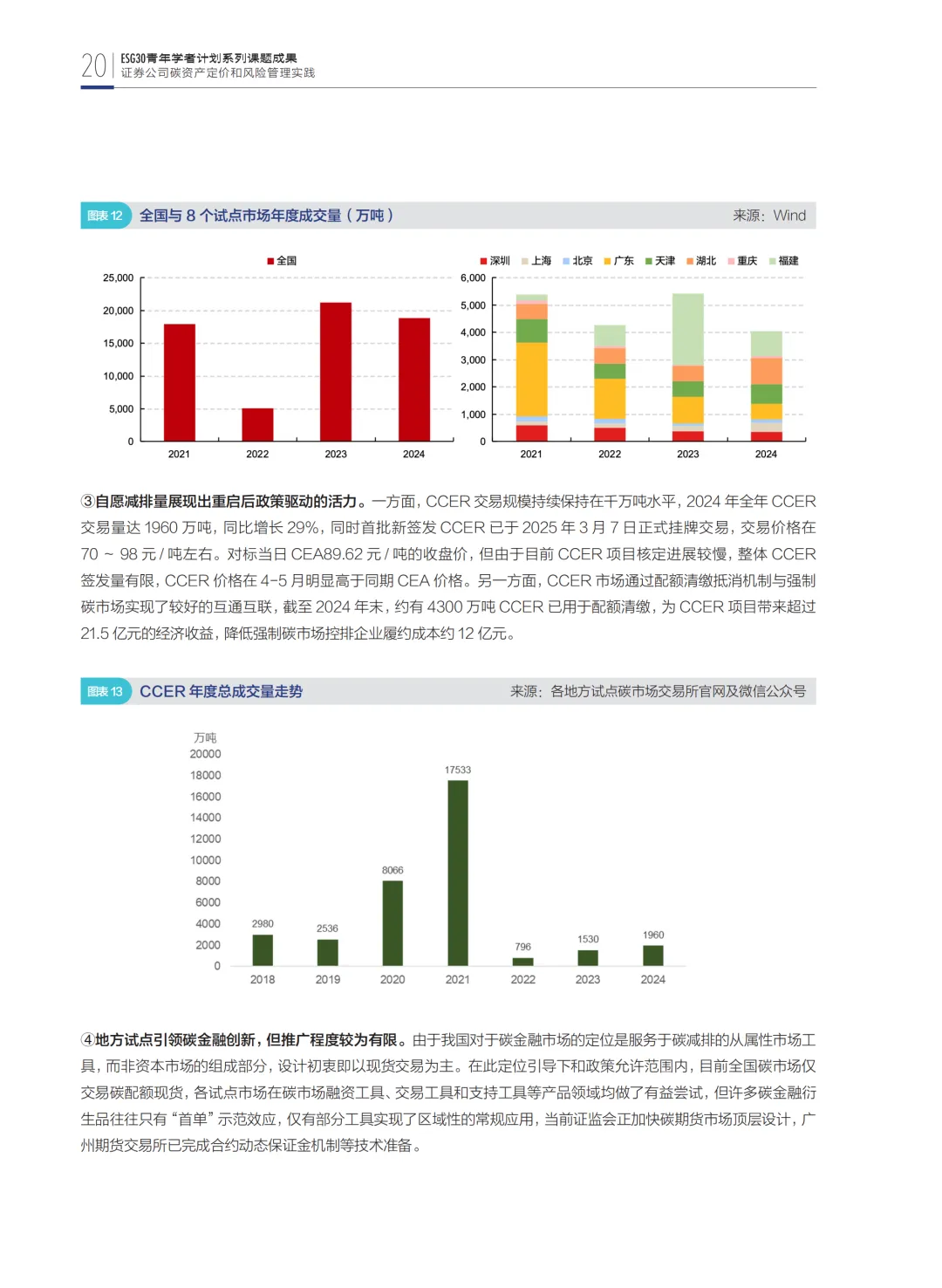 第二部分从微观视角探讨证券公司参与碳金融市场的业务模式,基于碳资产的特殊性,梳理碳定价机制和风险管理策略,深入研究券商在碳市场的角色定位,并结合实践案例剖析业务开展中的困难。