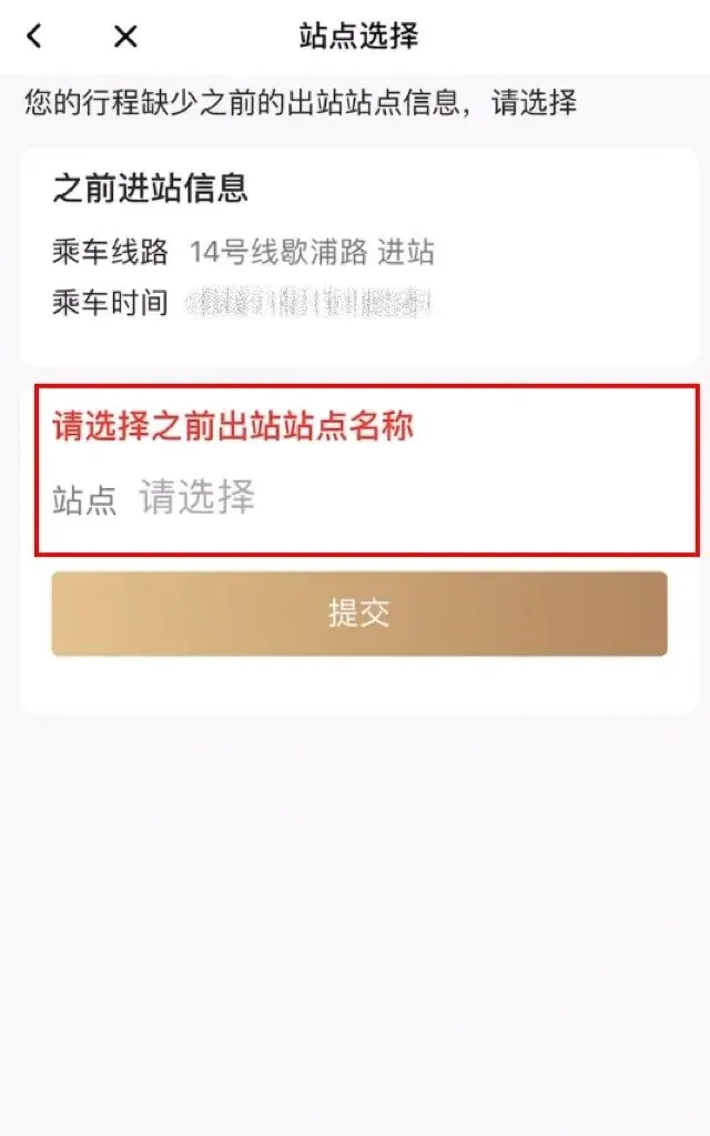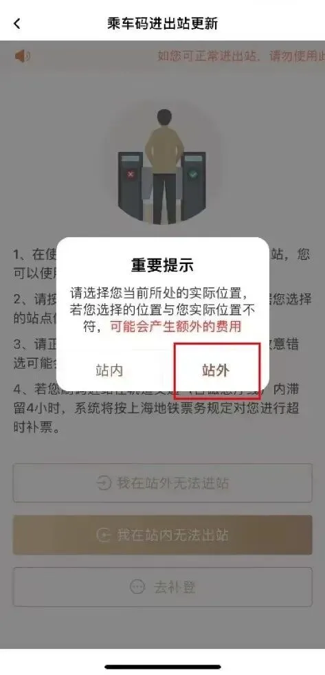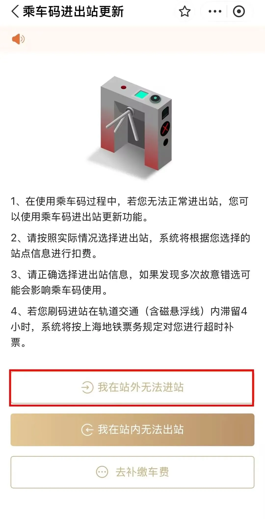 使用滴滴出行的用户,您可以通过随申码(上海城市出行码)乘车码下方,进入【自助补登】。如果是缺失出站信息,选择【上海地铁】-【我在站外无法进站】-【站外】-提交出站信息成功后,即可重新刷乘码进站。