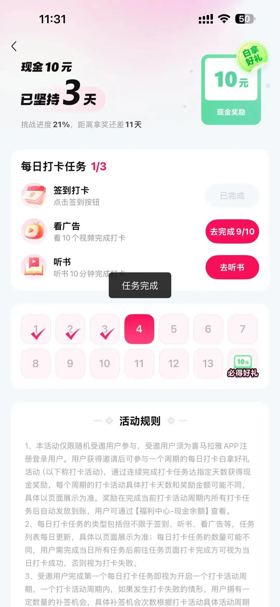 现在听歌软件也有签到看广告的,也是一笔不少的收入来源