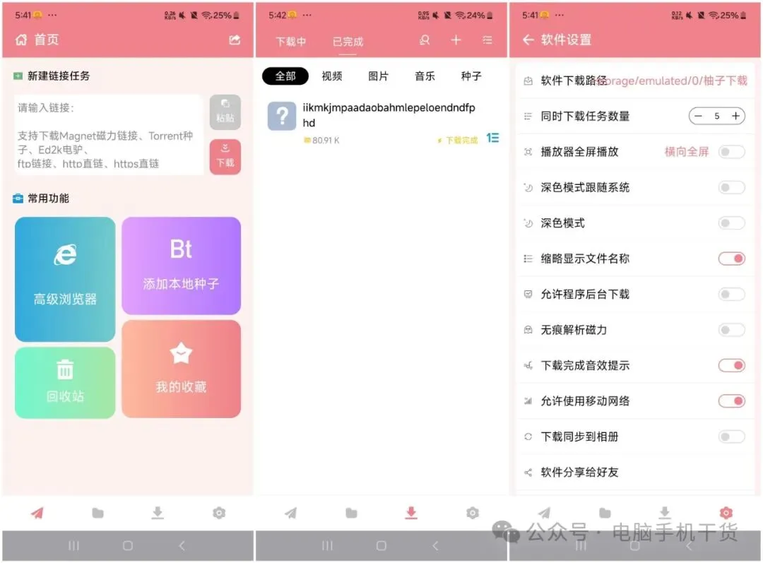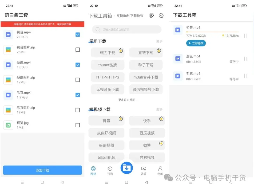 下载工具箱app是一款非常万能的手机下载工具软件。软件支持56种下载协议,体积轻便、操作简单,支持磁力、种子、微信视频号等下载方式,还可以离线缓存后观看视频哦~。支持46种下载协议,支持视频平台、短视频、嗅探、m3u8源加速下载,文件统一管理!