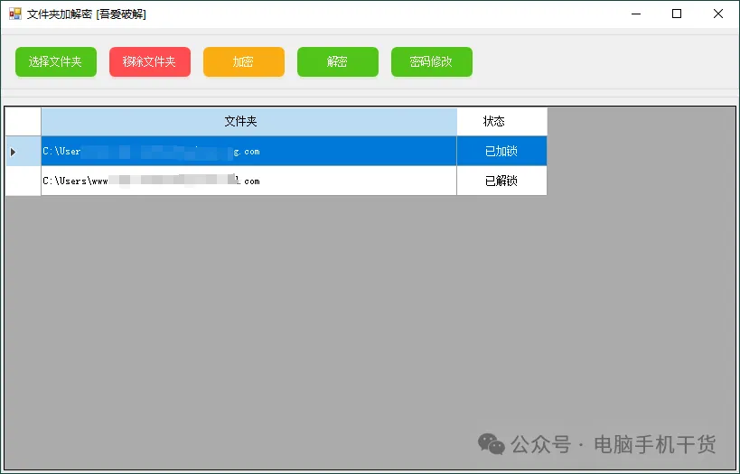 文件夹加密小工具采用c#编写,环境为.net 4.7,引用了miniExcel,用于加载和保存你设置好的文件夹列表,免得下次打开时找不到已经隐藏的文件夹。软件界面特别清爽简洁,选择一个文件夹就可以进行加密或解密了,如果不想使用这个文件夹,选中后点移除就从软件中即可去掉。加锁后的文件看不到,就算你显示隐藏,也无法打开了。