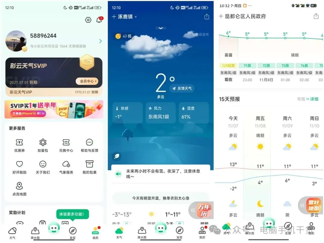 通过手机定位,不同于其他大部分天气软件只能看到一个笼统的“局部地区阵雨”的预报,彩云天气可以根据你当前位置给你做一个未来一小时内几点几分下雨或什么时候雨停的精准预报,从而帮助你决定出行方案。天气一直是人们日常生活所关注的,现在手机上有很多的天气应用,是人们日常生活出行的好帮手。关注实时天气,给你的日常生活提供便利