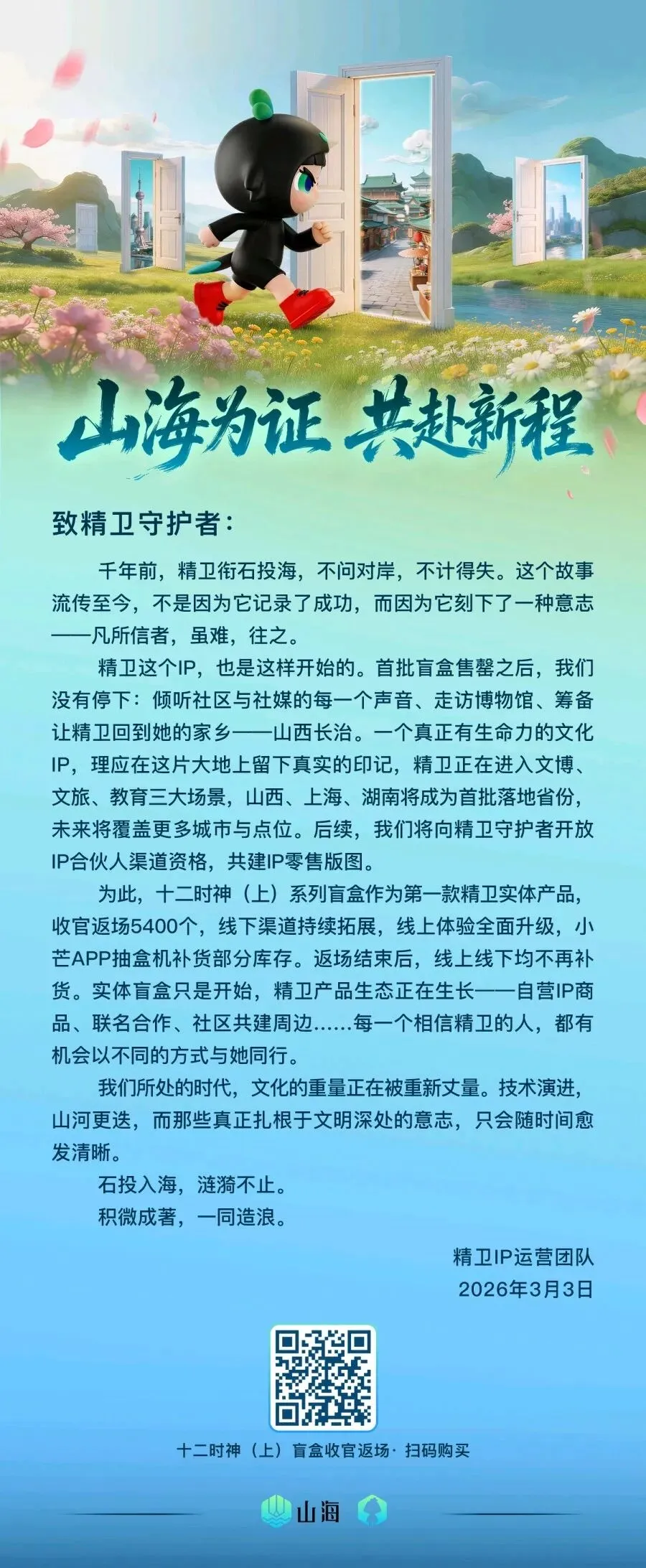 备受追捧的精卫实体盲盒也迎来了重要节点:作为首款精卫实体产品,十二时神(上)系列盲盒将收官返场5400个,线下渠道持续拓展,小芒APP抽盒机也将补货部分库存,返场结束后,线上线下均不再补货。本系列实体盲盒总量为10800份,售完即止,不再增发,收藏价值不言而喻。实体盲盒只是开始,精卫产品生态正在生长——自营IP商品、联名合作、社区共建周边……每一个相信精卫的人,都有机会以不同的方式与她同行。