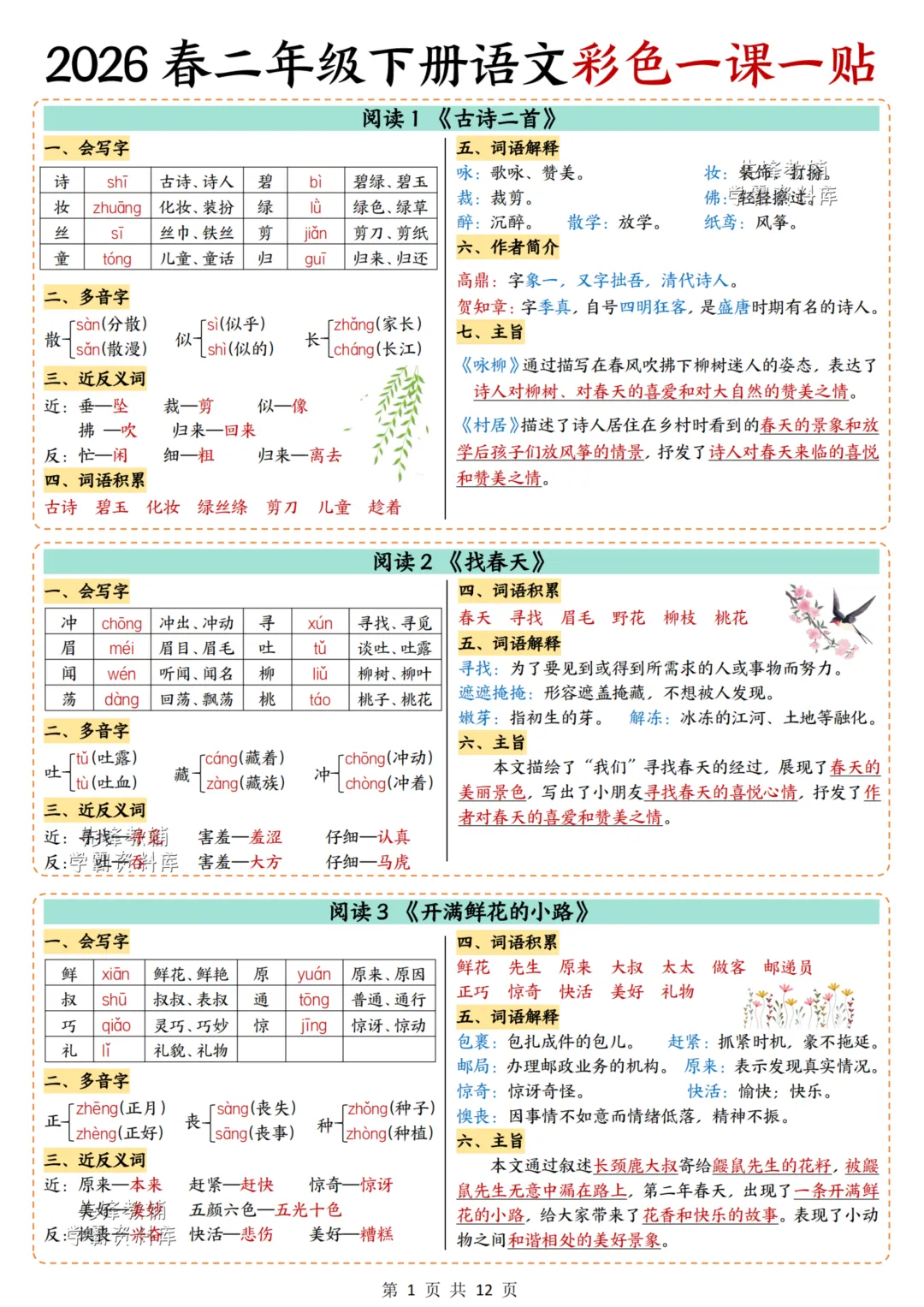今天为大家分享:当春风拂过柳梢,当纸鸢掠过晴空,语文课本里的文字便成了连接季节与心灵的桥梁。翻开二年级下册语文第一课,《古诗二首》与《找春天》的篇章,不仅是汉字与诗句的集合,更是一场关于自然与成长的诗意启蒙。