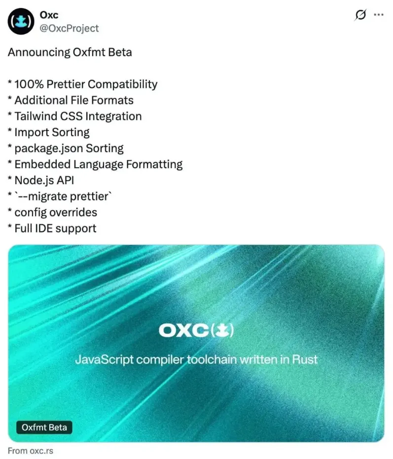 理解了Oxc就能简单说说 Oxfmt 了,Oxfmt 是 Oxc 生态中的代码格式化工具,也是目前已经基本上完成的 Rust 替换 Prettier 的例子。