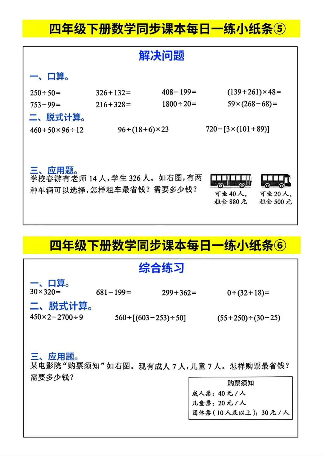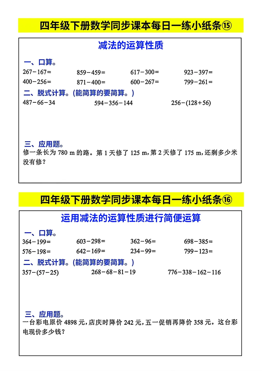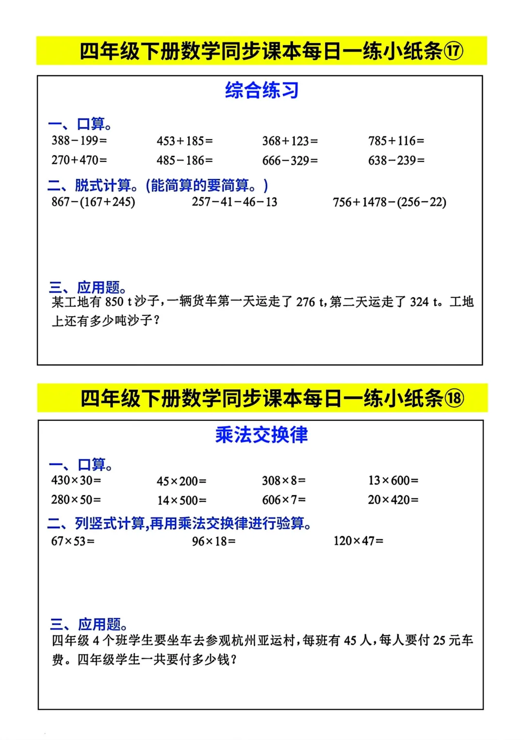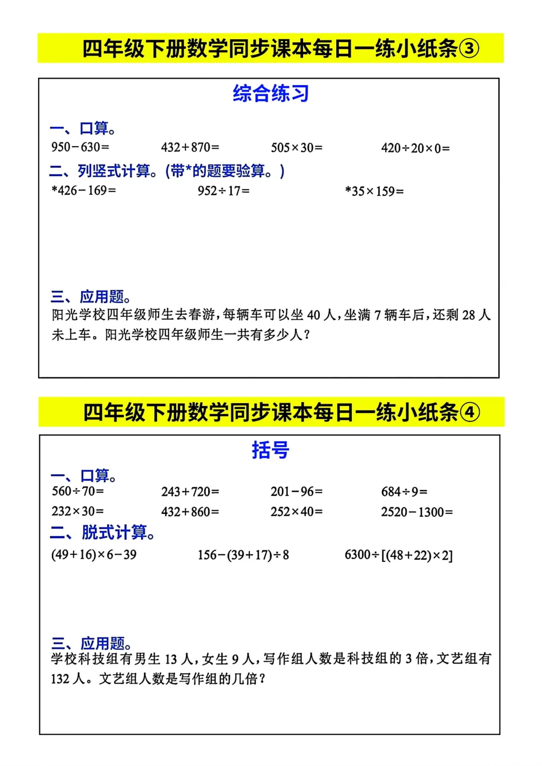 四年级下册数学同步课本每日一练小纸条(电子版可打印)