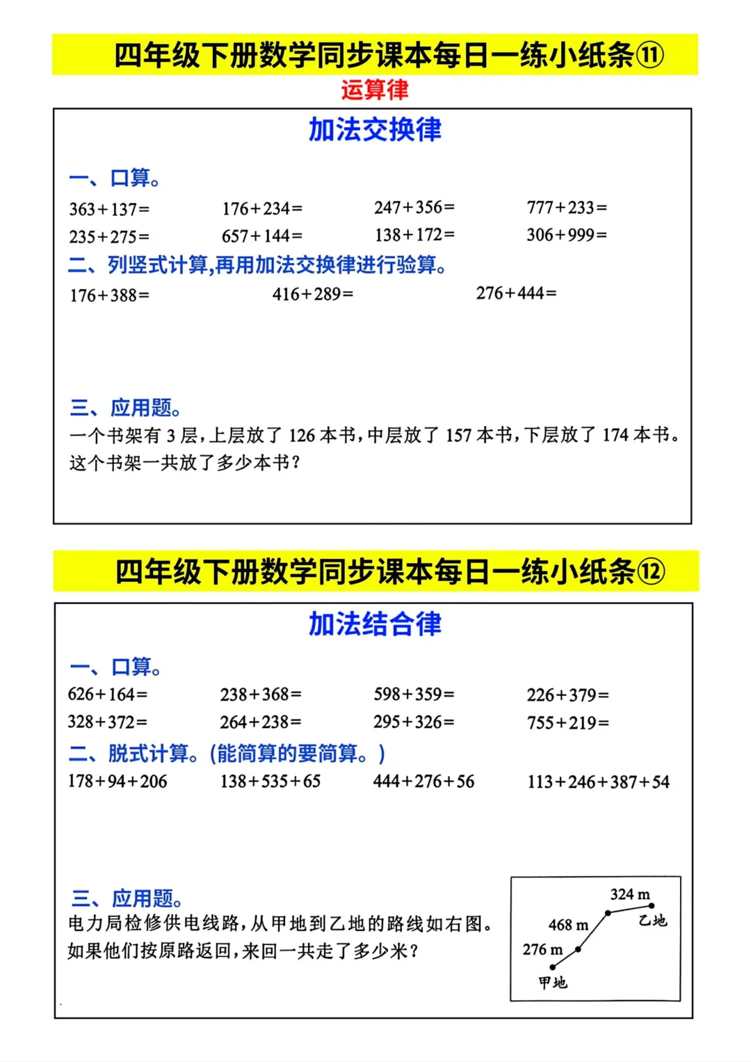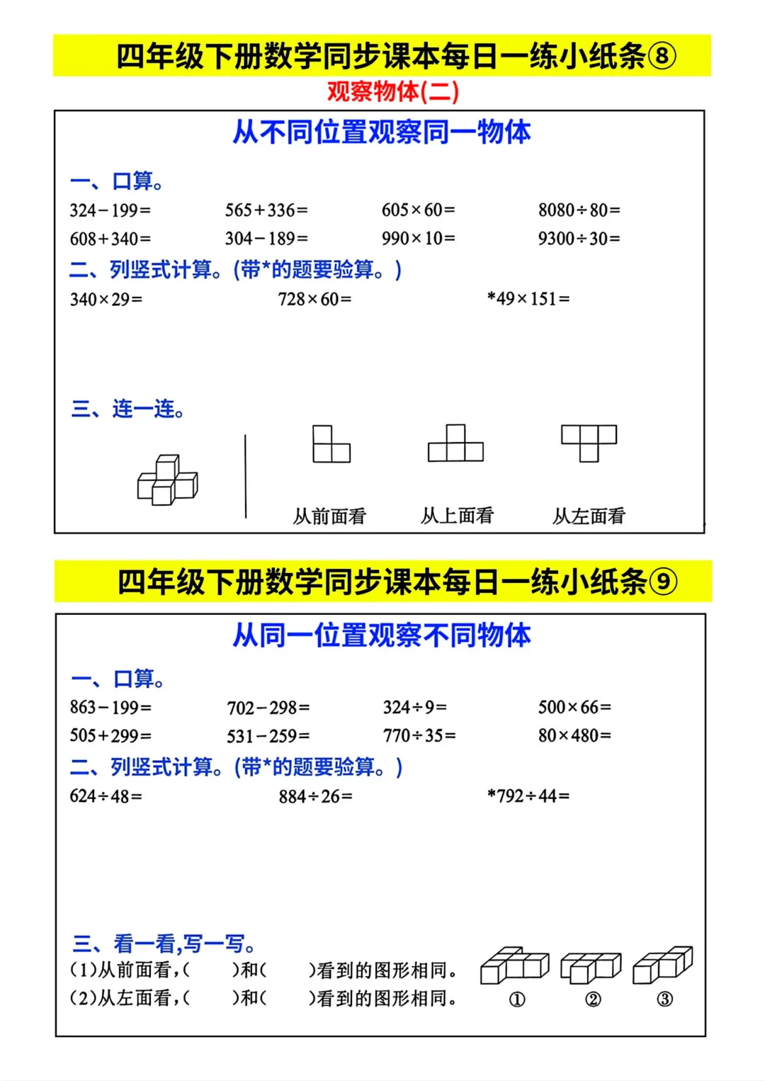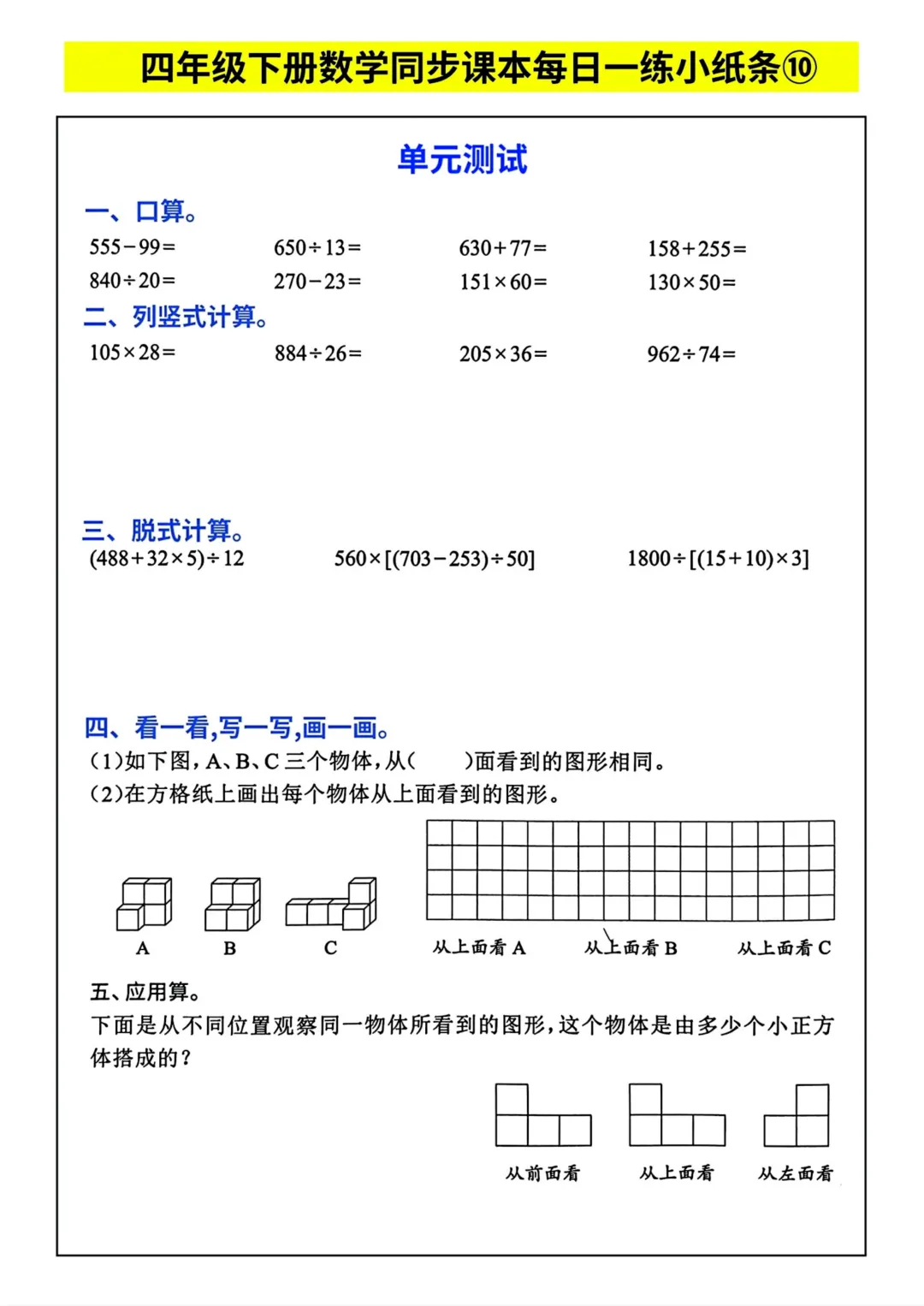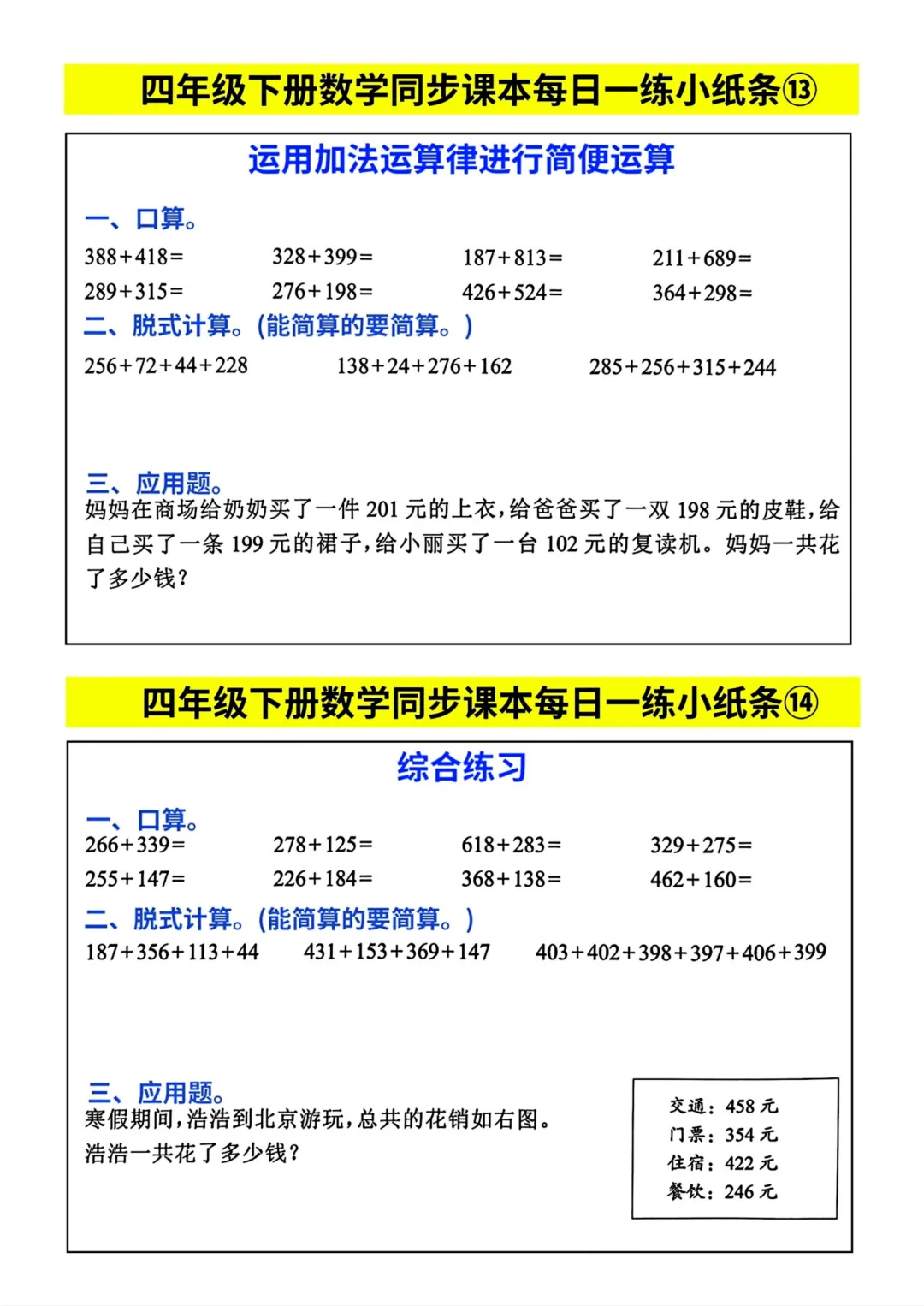 四年级下册数学同步课本每日一练小纸条(电子版可打印)