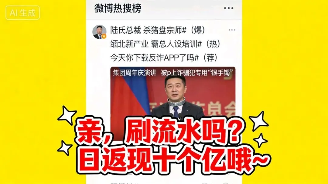 配图是他昨天在集团周年庆上的演讲视频截图,脖子上被P了块诈骗犯专用“银手镯”,旁边还有艺术字:“亲,刷流水吗?日返现十个亿哦~”