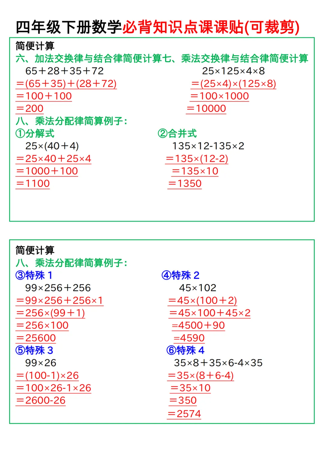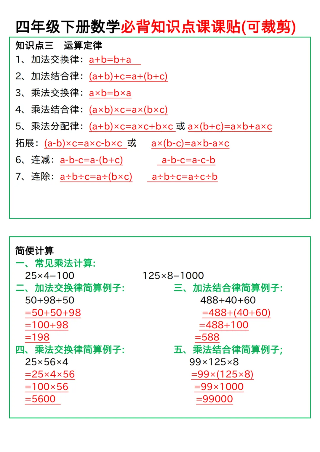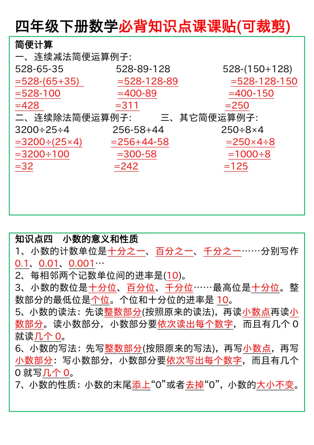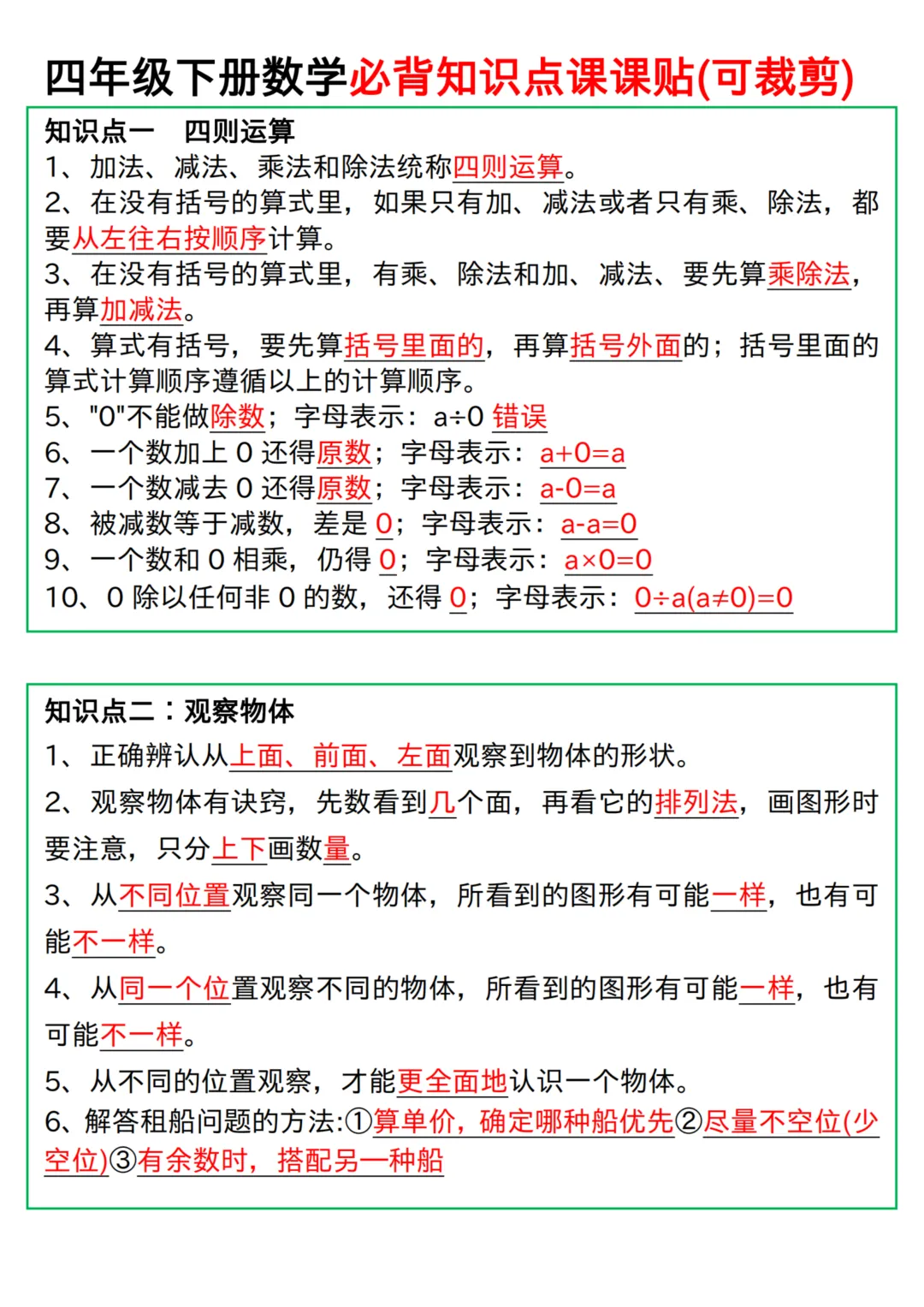 四年级下册数学人教版必背知识点课课贴(电子版可打印)
