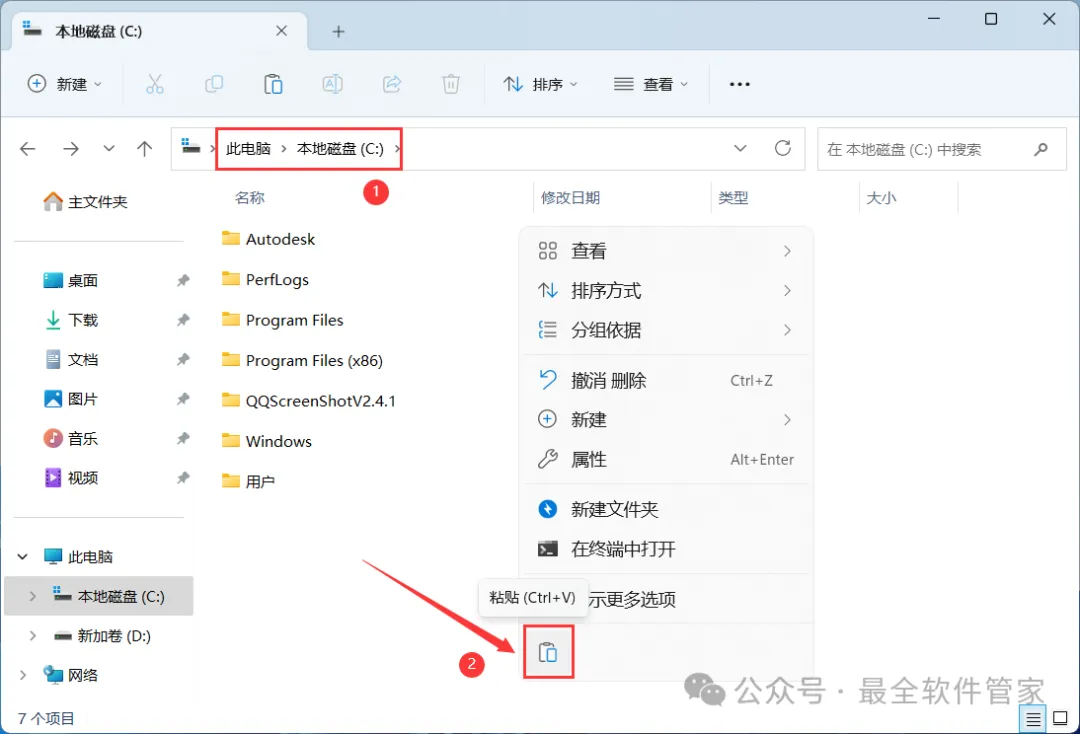 4、打开本地磁盘C,再右键文件夹的空白处,点击【粘贴按钮】