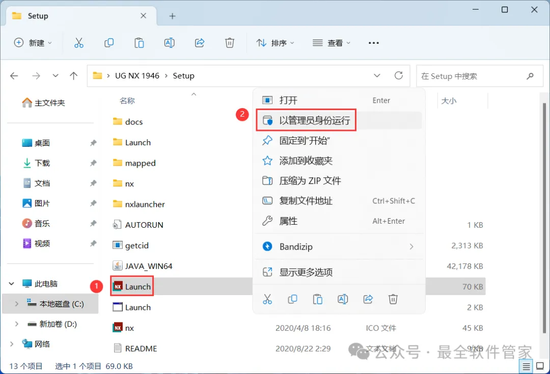 13、回到Setup文件夹,找到【Launch】应用程序,右键选择【以管理员身份运行】它