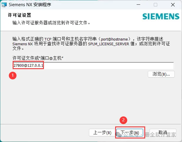 18、许可证文件输入:27800@127.0.0.1,再点击【下一步】