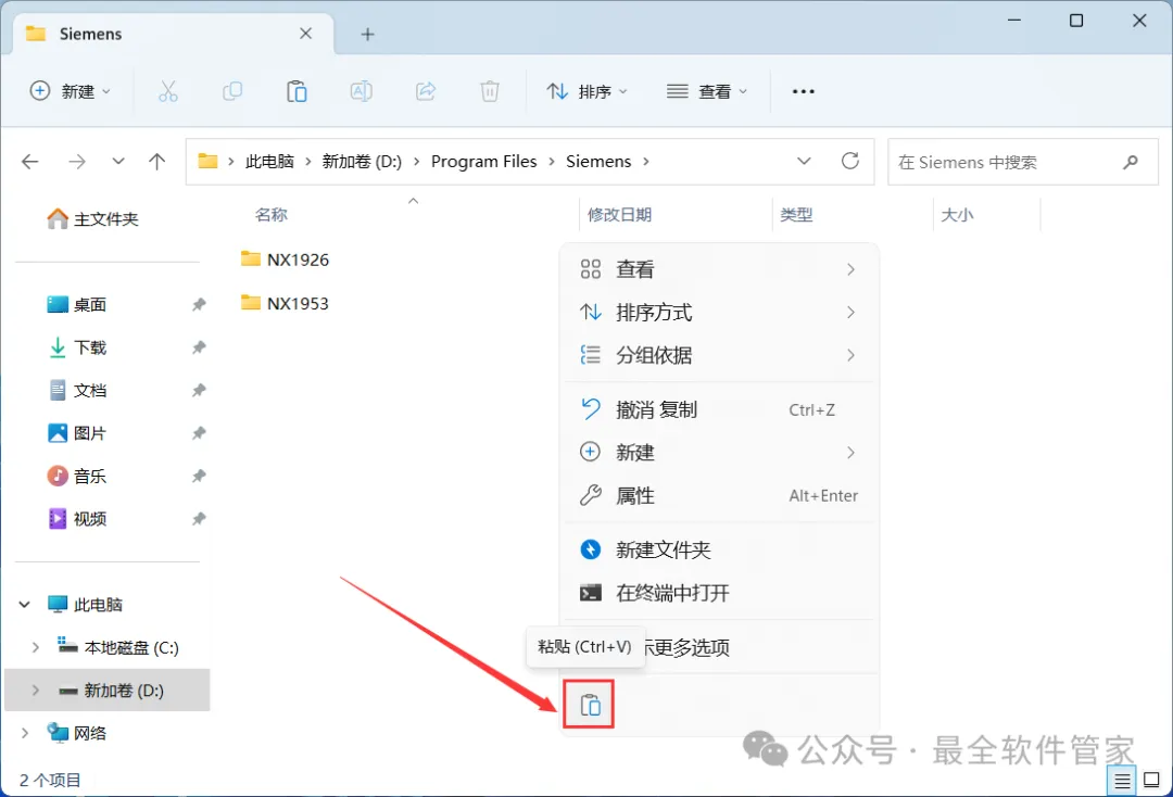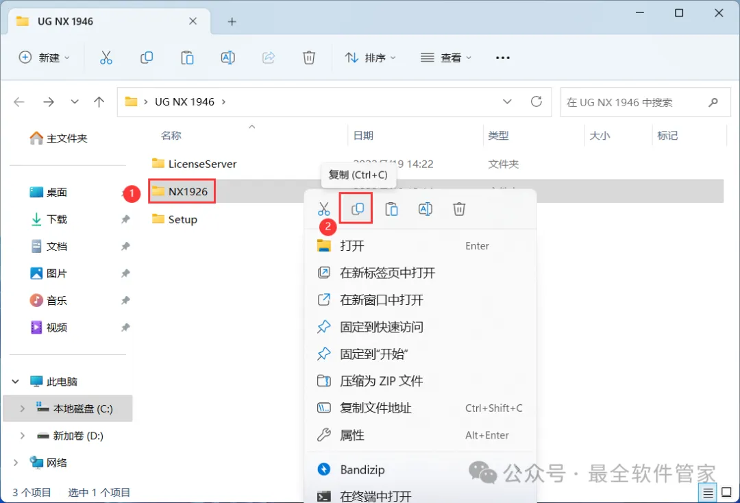 24、回到UG NX 1946文件夹,找到【NX1926】文件夹,右键点击【复制按钮】
