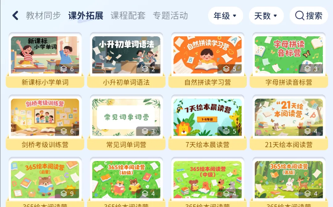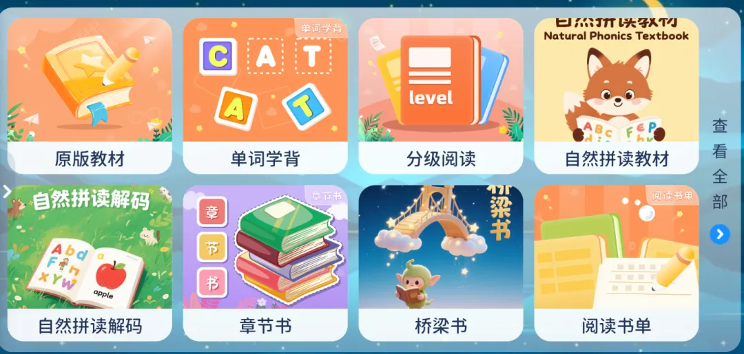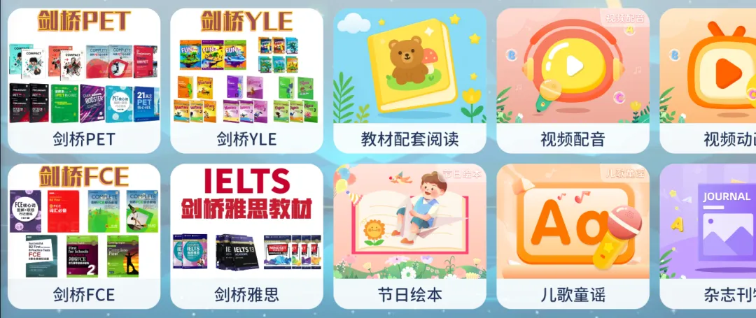 不用再东奔西走找资源!专属APP上整合了海量同步教材、原版绘本及配套习题,全面覆盖英语听说读练记全维度,贴合不同阶段学员的学习需求。
