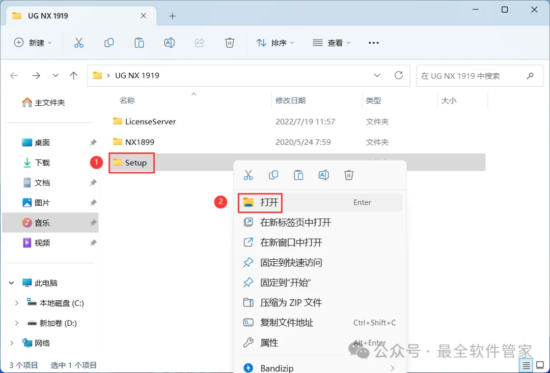 8、回到UG NX 1919文件夹,找到【Setup】文件夹,右键【打开】它