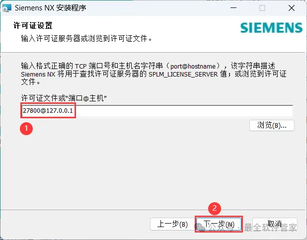 18、许可证文件输入:27800@127.0.0.1,再点击【下一步】