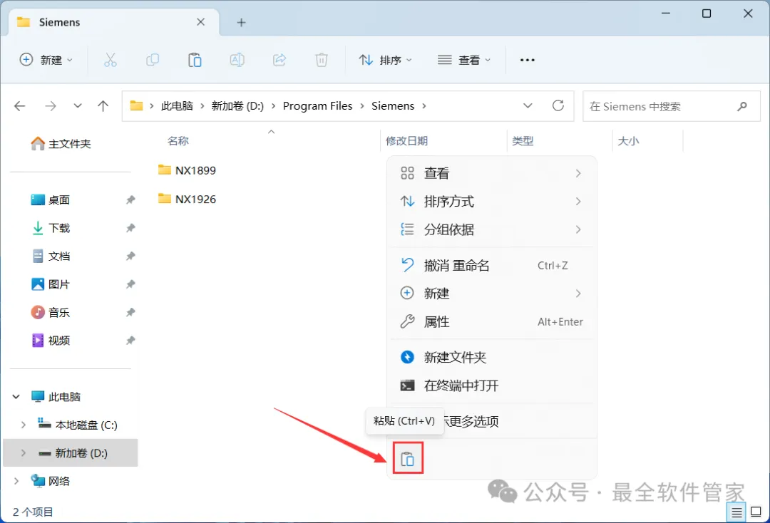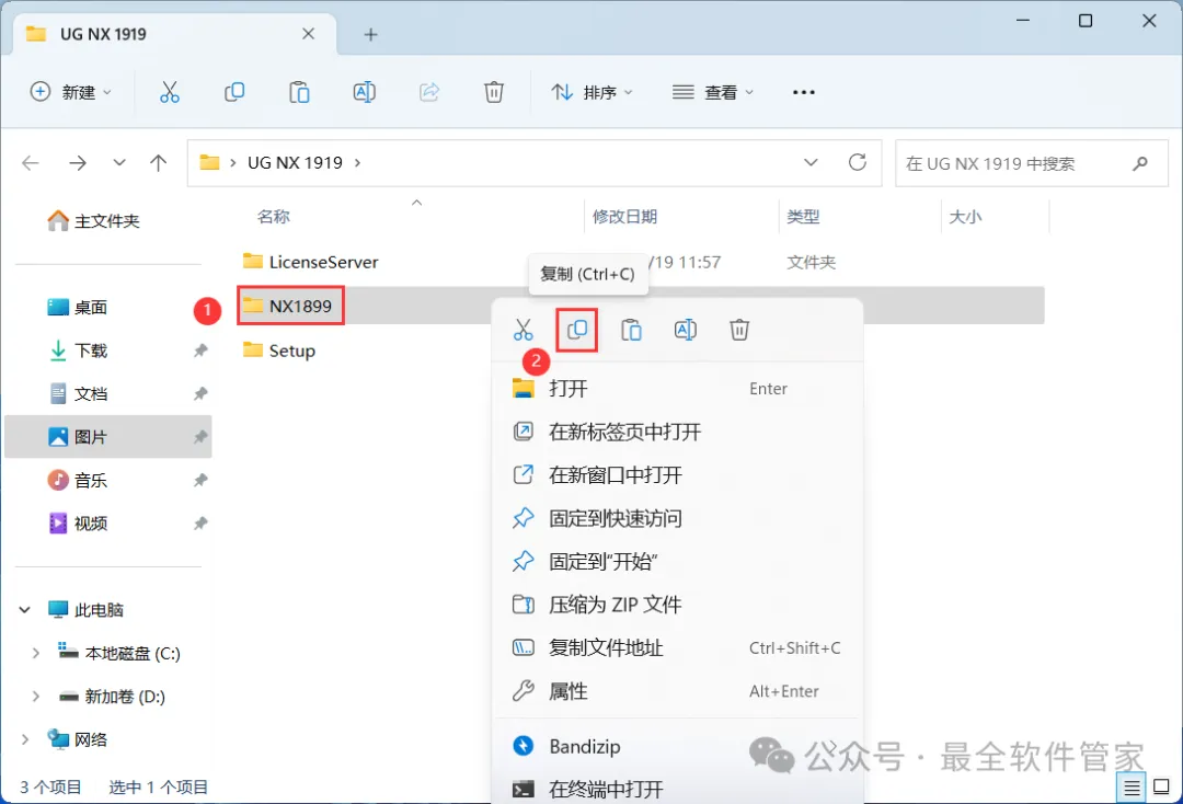 24、回到UG NX 1919文件夹,找到【NX1899】文件夹,右键点击【复制按钮】