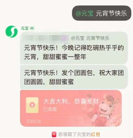 4、群里发“元宵节快乐”“元宵节红包”或聊聊天,注意需要艾特@元宝