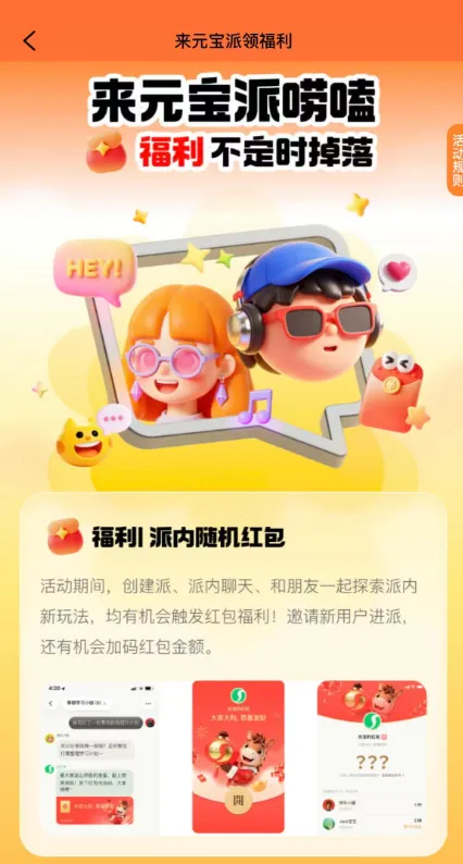 1、新建派群,群里发送消息,并且@元宝,等待片刻,就会自动弹一个红包哈