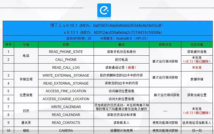 “饿了么”申请了11个权限,包括拨打电话、日历等。在测试新版本时,专家发现旧版中的拨打电话和日历权限已删除,但又新增了“读取通话记录”权限。网友纷纷表示,我就想点个外卖,你凭啥要看我的日历和通话?