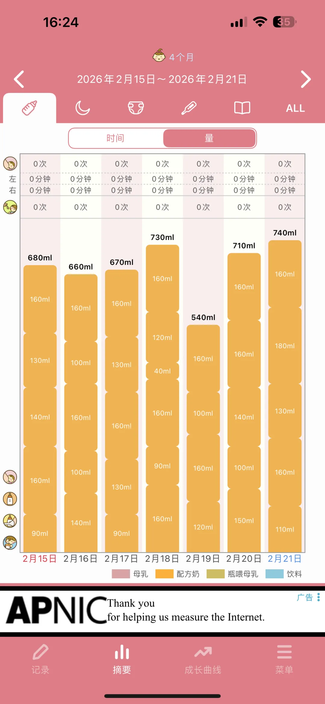 一款记录宝宝奶量的APP,简洁的页面,没有太复杂的功能,就是记录宝宝每天喝奶睡觉时间,拉臭臭次数、成长曲线等。就是底部有广告,直接忽视就行。
