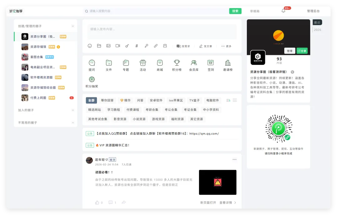 加入圈子后即可进入 资源赞助群 ,群内每天都会分享大量的资源, 各平台软件、YS、付费文章/课程、考研考公课程等等,纷传圈子+赞助群,稳定获取资源: