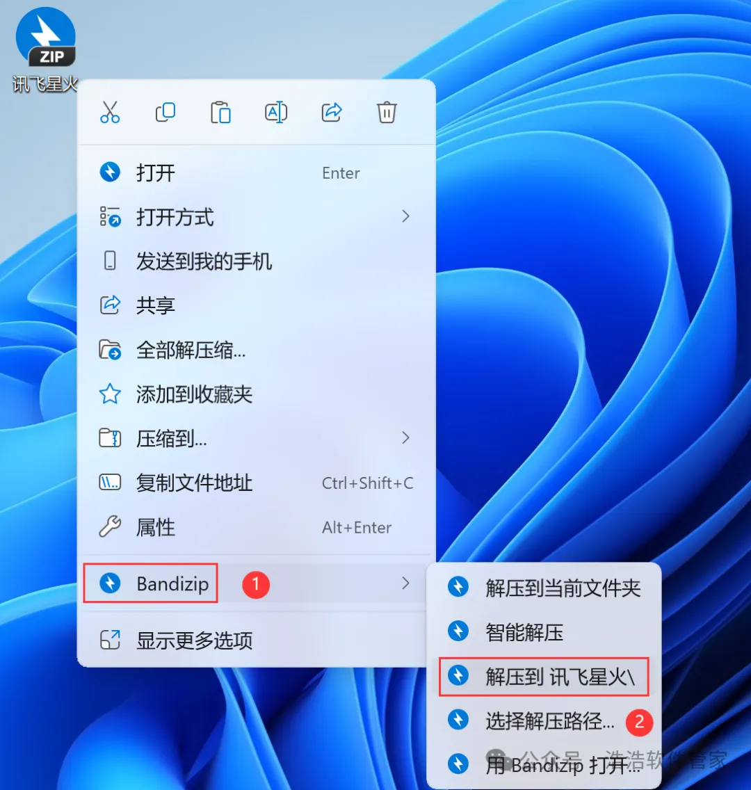 1、下载讯飞星火软件安装包到电脑上,右键选择【解压到讯飞星火\】