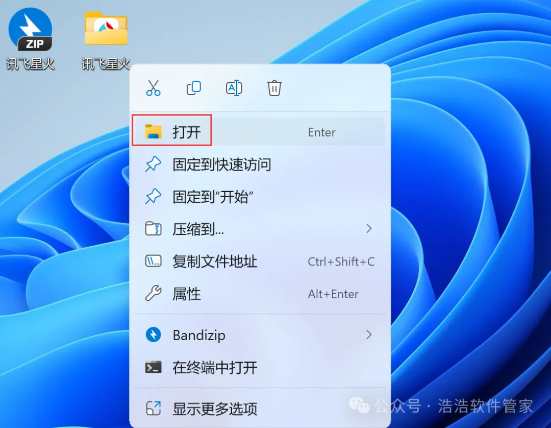 7、回到桌面,右键桌面上的【讯飞星火软件图标】,点击【打开】