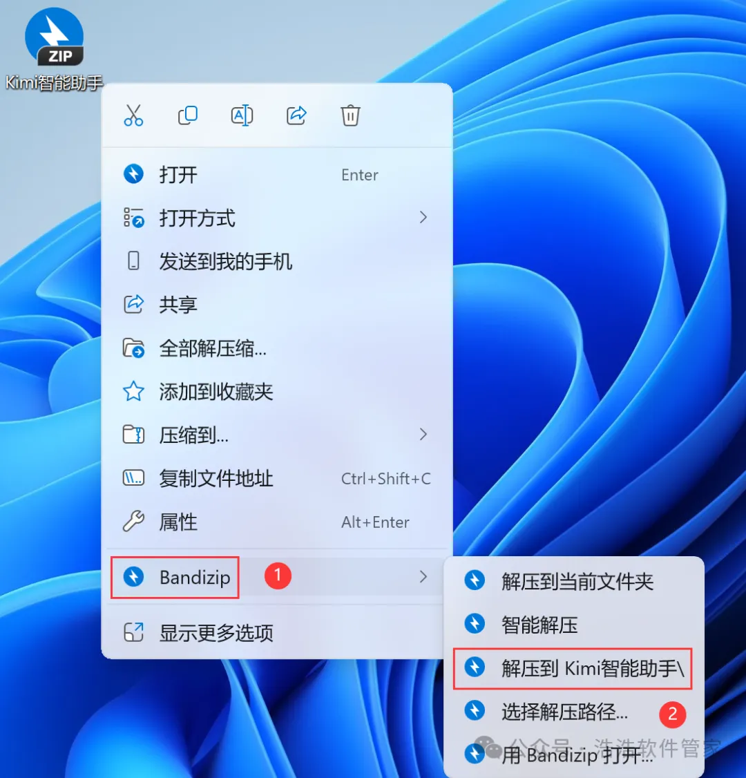 1、下载Kimi智能助手软件安装包到电脑上,右键选择【解压到Kimi智能助手\】