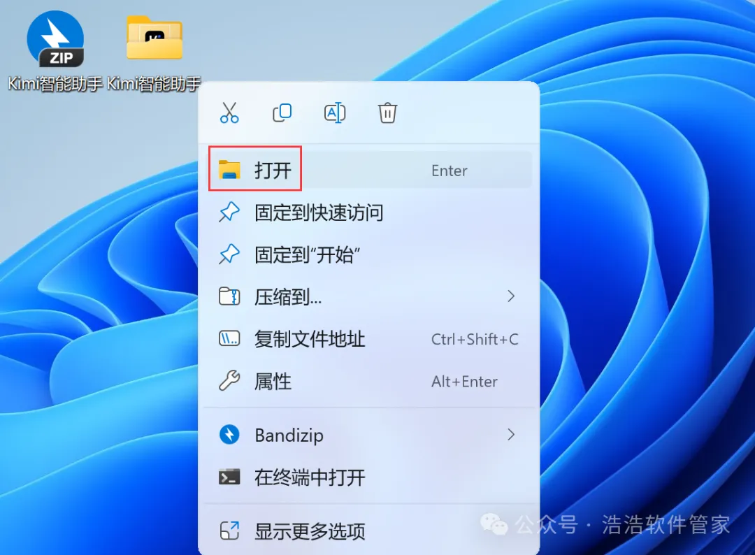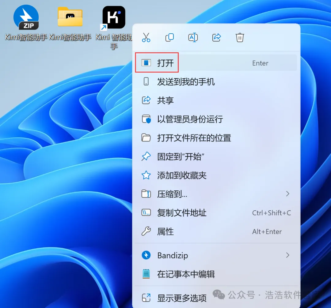 8、回到桌面,右键桌面上的【Kimi智能助手软件图标】,点击【打开】
