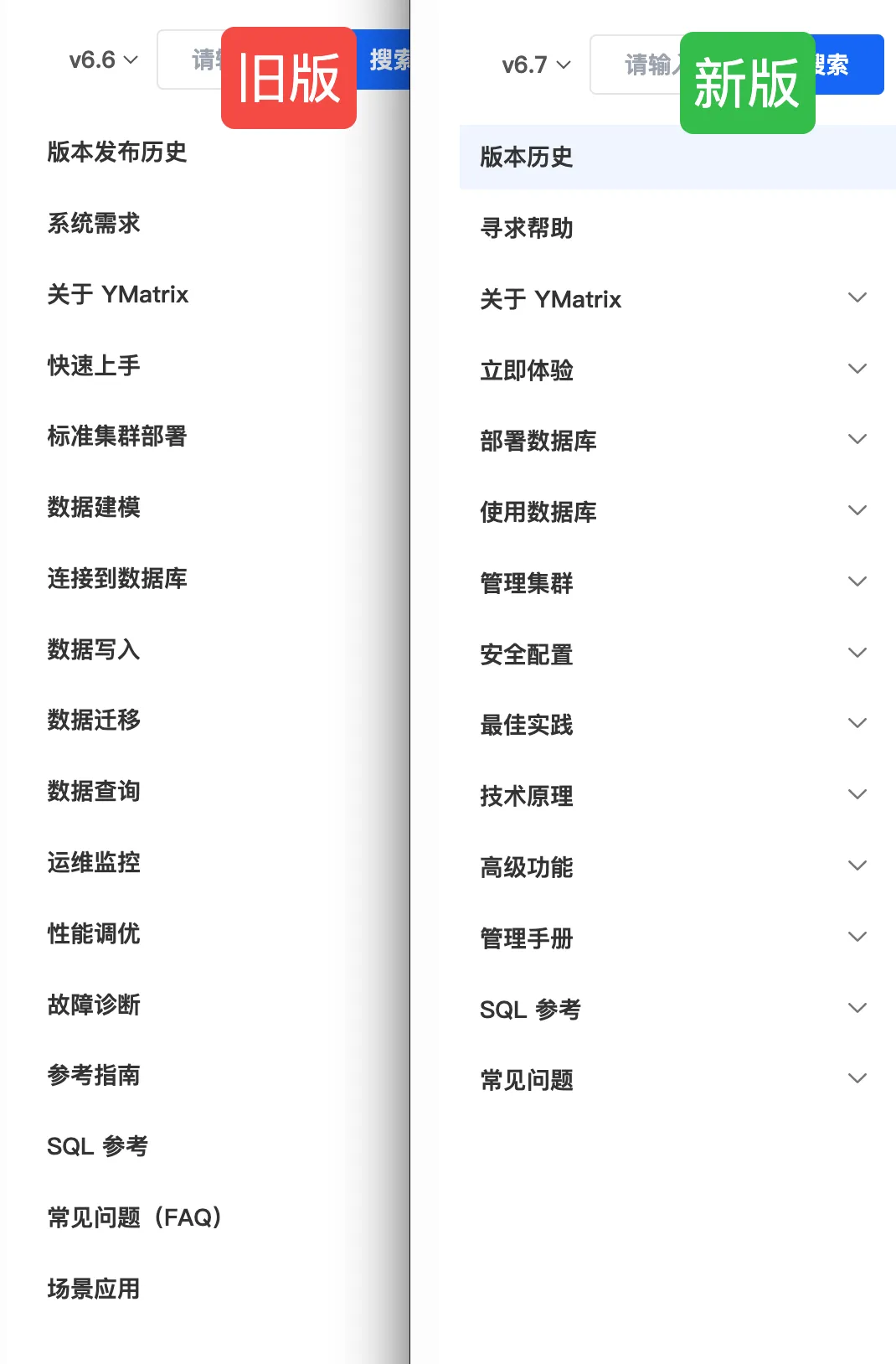 新版目录延续了旧版以版本历史为起点的结构,方便快速浏览版本升级内容。但在后续章节采用了更符合用户使用习惯的组织方式,以 关于 YMatrix、立即体验、部署数据库、数据库使用、安全配置 等核心场景为一级目录,帮助用户快速定位所需内容,更快上手体验。