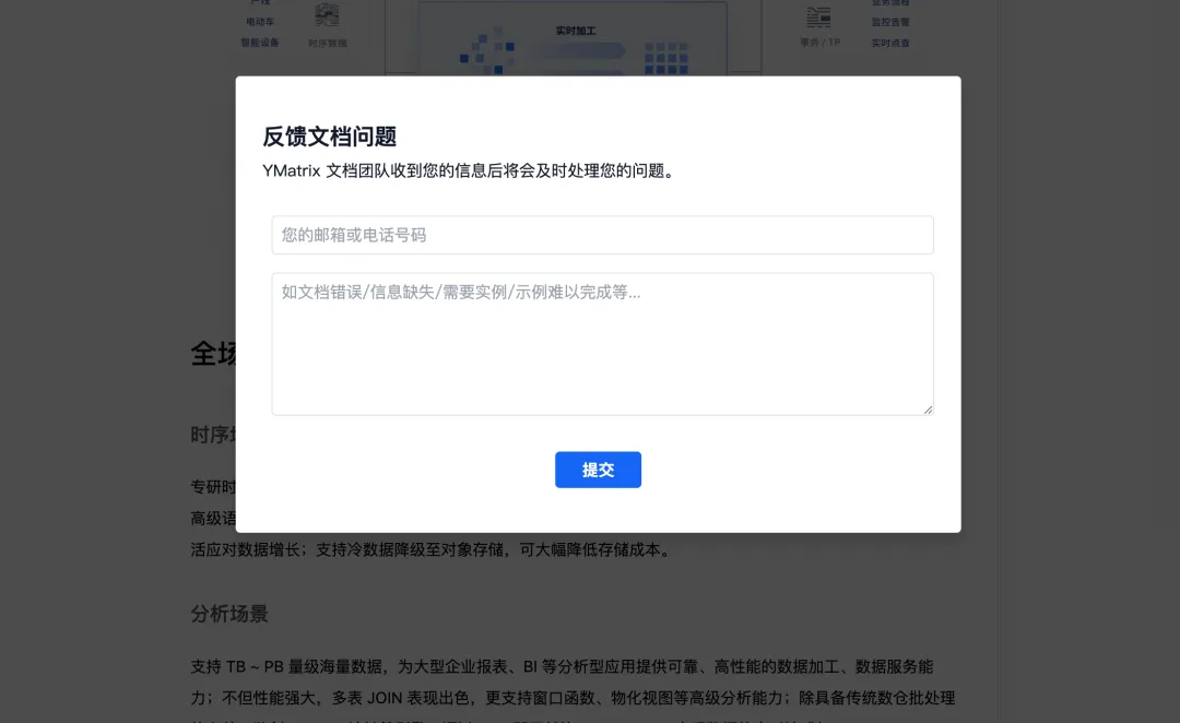 新版文档页面增加了 “问题反馈” 按钮,为用户提供了便捷的文档问题反馈渠道。建立了用户与文档团队之间的直接沟通桥梁,实现文档内容的持续优化。用户只需填写联系方式和问题相关描述,即可完成反馈提交。