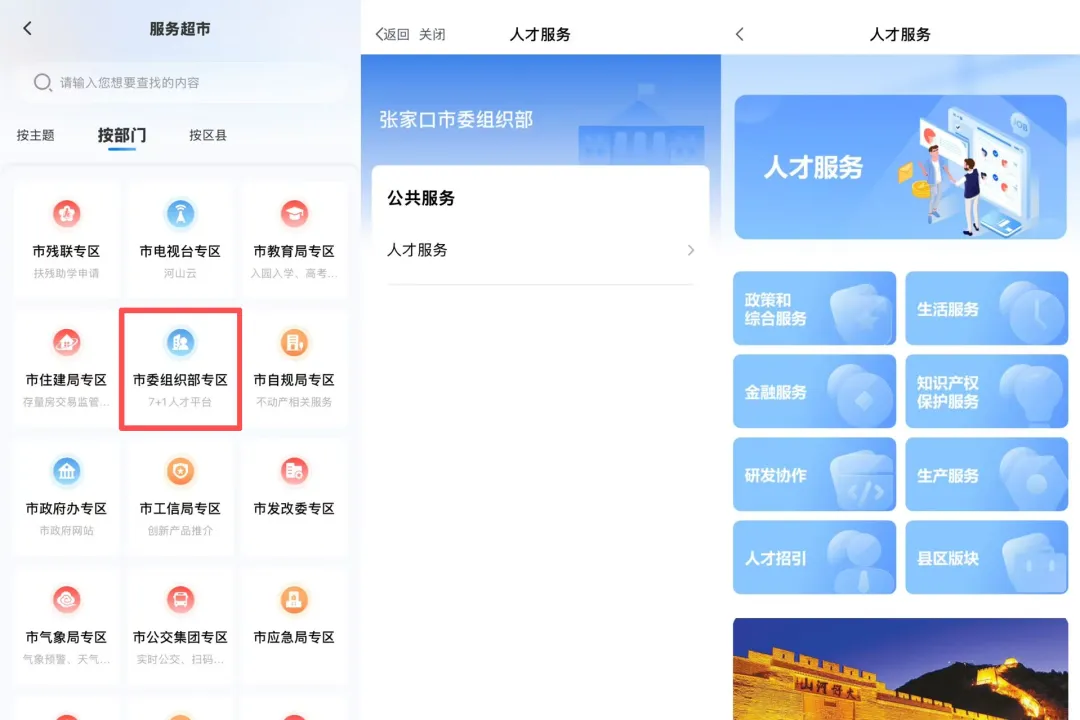 打开“幸福张家口”App → 进入首页【服务超市】→ 选择【按部门查找】→ 点击【市委组织部专区】,即可进入“7+1”人才服务平台,根据需求选择相应版块。