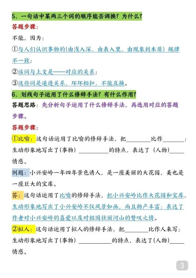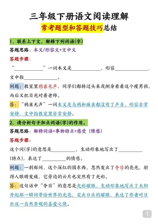这份三年级下册语文阅读理解常考题型+答题技巧汇总太实用了!全覆盖词义解释、词语作用、修辞赏析、描写手法等八大核心常考题型,每个题型都配清晰答题思路+固定答题步骤+典型例题解析,手把手教孩子踩准得分点,告别阅读理解不会答、答不全的问题。条理清晰、方法易懂!