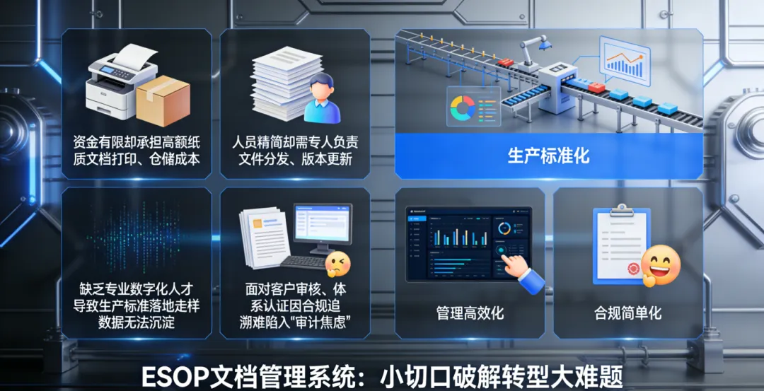 中小制造企业的数字化转型,最怕“投入大、落地难、见效慢”,而传统SOP管理的诸多痛点,更是与中小企业的发展短板形成叠加:资金有限却要承担高额的纸质文档打印、仓储成本;人员精简却要安排专人负责文件分发、版本更新;缺乏专业数字化人才,导致生产标准落地走样、数据无法沉淀;面对客户审核、体系认证,又因合规追溯难陷入“审计焦虑”。