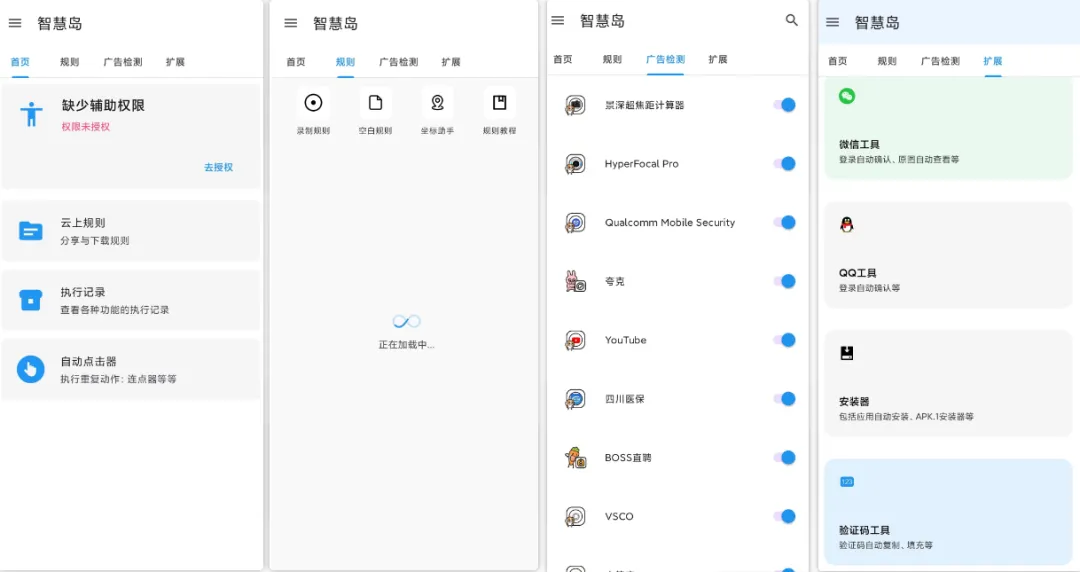 智慧岛(原名禅师)是一款相当简单易用的自动化任务+去广告应用,可以去除软件的开屏广告和内置广告,并且可以实现微信的自动确认登录电脑端(含QQ)、自动查看原图、自动勾选原图,验证码自动复制等功能。